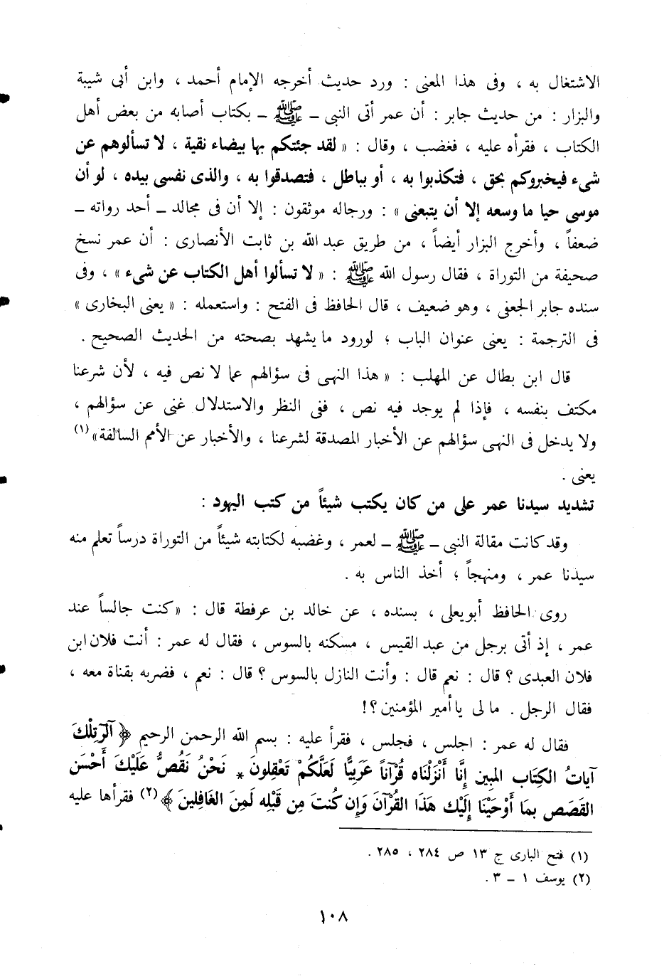 الاشتغال به، وفي هذا المعنى: ورد حديث أخرجه الإمام أحمد، وابن أبي شيبة والبزار، من حديث جابر: أن عمر أتى النبي صلى الله عليه وسلم بكتاب أصابه من بعض أهل الكتاب، فقرأه عليه، فغضب، قال: "لقد جئتكم بها بيضاء نقية، لا تسألوهم عن شيء فيخبروكم بحق، فتكذبوا به، أو بباطل، فتصدقوا به، والذي نفسي بيده لو أن موسى حيا ما وسعه إلا أن يتبعني" ورجاله موثقون؛ إلا أن في مجالد -أحد رواته- ضعفًا، وأخرج البزار أيضا من طريق عبد الله بن ثابت الأنصاري: أن عمر نسخ صحيفة من التوراة، فقال رسول الله صلى الله عليه وسلم: "لا تسألوا أهل الكتاب عن شيء"، وفي سنده جابر الجعفي؛ وهو ضعيف، قال الحافظ في الفتح: واستعمله: "يعني البخاري" في الترجمة: يعني عنوان الباب، لورود ما يشهد بصحته من الحديث الصحيح.