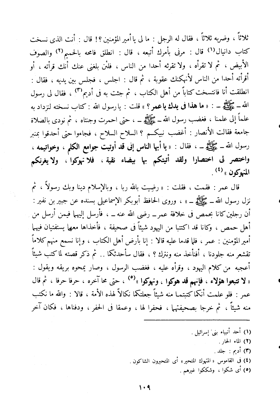 قال عمر: فقمت، فقلت: "رضيت بالله ربا، وبالإسلام دينا وبك رسولا، ثم نزل رسول الله صلى الله عليه وسلم" وروى الحافظ أبو بكر الإسماعيلي بسنده عن جبير بن نفير: أن رجلين كانا بحمص في خلافة عمر رضي الله عنه فأرسل إليهما فيمن أرسل من أهل حمص، وكان قد اكتتبا من اليهود شيئا في صحيفة، فأخذاها معهما يستفتيان فيهما أمير المؤمنين عمر، فلما قدما عليه قالا: إنا بأرض أهل الكتاب، وإنا نسمع منهم كلاما تقشعر منه جلودنا، أفنأخذ منه ونترك؟ فقال: سأحدثكما ... ثم ذكر قصته لما كتب شيئا أعجبه من كلام اليهود، وقرأه عليه، فغضب الرسول، وصار يمحوه بريقه ويقول: "لا تتبعوا هؤلاء؛ فإنهم قد هوكوا، وتهوكوا" 5، حتى محا آخره، حرفا حرفا، ثم قال عمر: فلو علمت أنكما كتبتما منه شيئا جعلتكما نكالا لهذه الأمة، قالا: والله ما نكتب منه شيئا، ثم خرجا بصحيفتهما، فحفرا لها، وعمقا في الحفر، ودفناها، فكان آخر