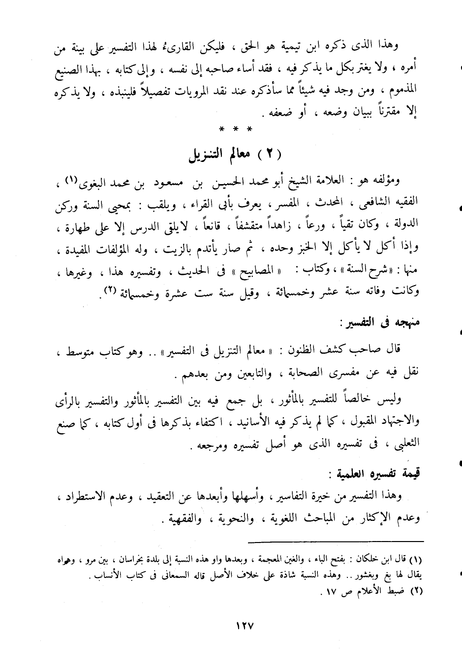 قال صاحب كشف الظنون: "معالم التنزيل في التفسير".... وهو كتاب متوسط، نقل فيه عن مفسري الصحابة، والتابعين ومن بعدهم.