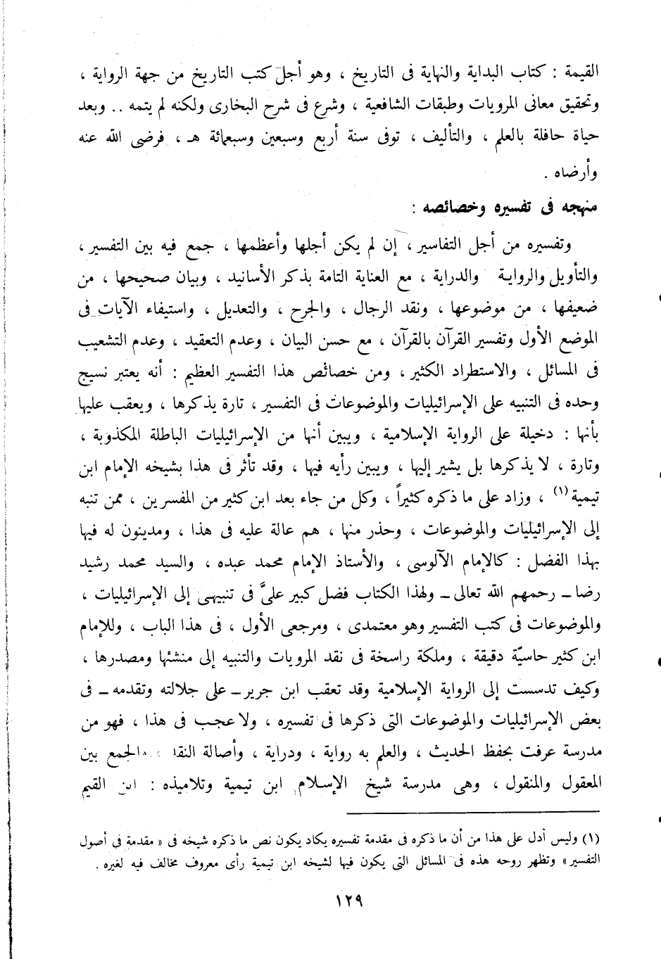 1 وليس أدل على هذا من أن ما ذكره في مقدمة تفسيره يكاد يكون نص ما ذكره شيخه في "مقدمة في أصول التفسير"، وتظهر روحه هذه في المسائل التي يكون لشيخه ابن تيمية رأي معروف مخالف فيه لغيره.
