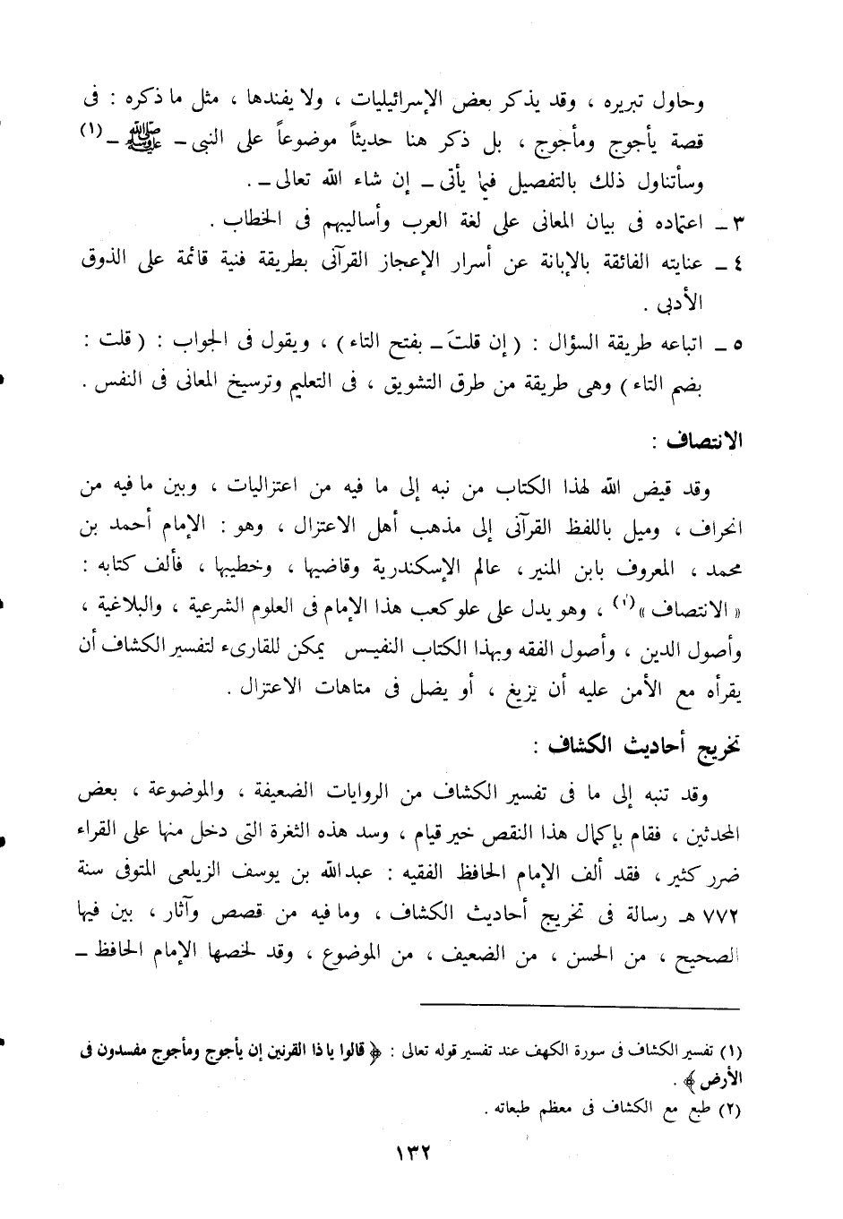 وقد قيض الله لهذا الكتاب من نبه إلى ما فيه من اعتزاليات، وبين ما فيه من انحراف، وميل باللفظ القرآني إلى مذهب أهل الاعتزال، وهو: الإمام أحمد بن محمد المعروف بابن المنير، عالم الإسكندرية وقاضيها، وخطيبها، فألف كتابه: "الانتصاف"2، وهو يدل على علو كعب هذا الإمام في العلوم الشرعية، والبلاغية، وأصول الدين، وأصول الفقه، وبهذا الكتاب النفيس يمكن للقارئ لتفسير الكشاف أن يقرأه مع الأمن عليه أن يزيغ، أو يضل في متاهات الاعتزال.