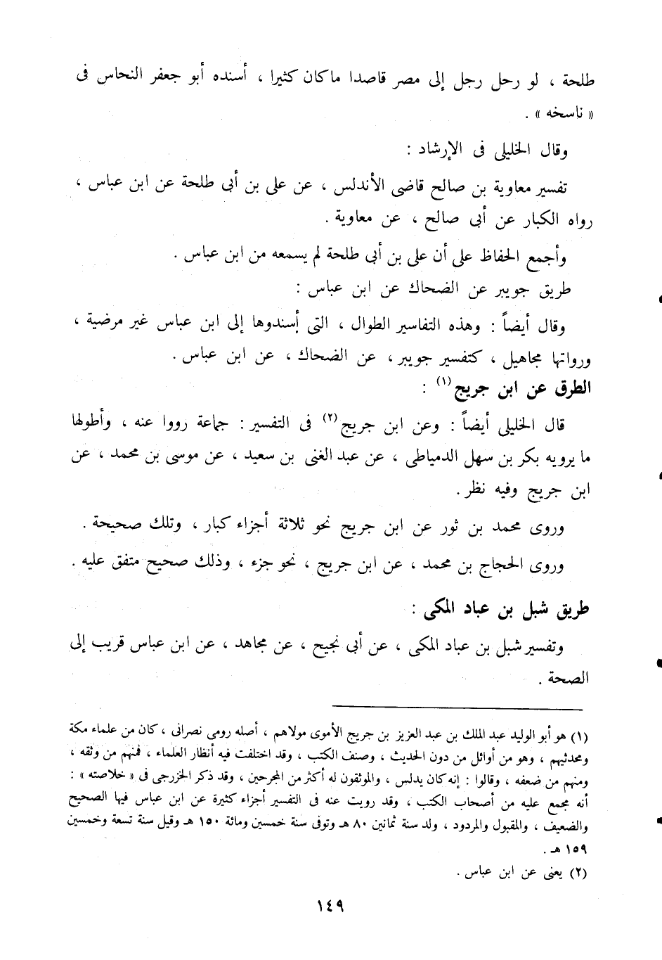 1 هو أبو الوليد عبد الملك بن عبد العزيز بن جريج الأمور مولاهم أصله رومي نصراني، كان من علماء مكة ومحدثيهم، وهو من أوائل من دوَّن الحديث، وصنف الكتب، وقد اختلفت فيه أنظار العلماء، فمنهم من وثَّقَه، ومنهم من ضعفه، وقالوا: إنه كان يدلس، والموثقون له أكثر من المجرحين، وقد ذكر الخزرجي في "خلاصته": أنه مجمع عليه من أصحاب الكتب، وقد رويت عنه في التفسير أجزاء كثيرة عن ابن عباس؛ فيها الصحيح والضعيف، والمقبول والمردود، ولد سنة ثمانين 80هـ وتوفي سنة خمسين ومائة 150هـ وقيل: سنة تسعة وخمسين 159هـ.