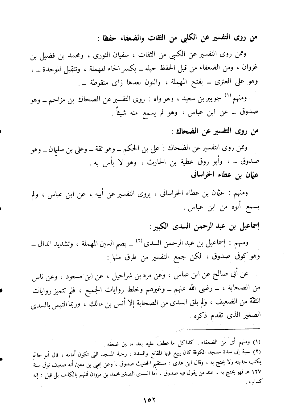 2 نسبة إلى سدة مسجد الكوفة كان يبيع فيها المقانع والسدة: رحبة المسجد التي تكون أمامه، قال أبو حاتم: يكتب حديثه ولا يحتج به، وقال ابن عدي: مستقيم الحديث، صدوق، وعن يحيى بن معين أنه ضعيف. توفي سنة 127هـ فهو يحتج به عند من يقول فيه صدوق، أما السدي الصغير محمد بن مروان فمتهم بالكذب بل قيل: إنه كذاب.