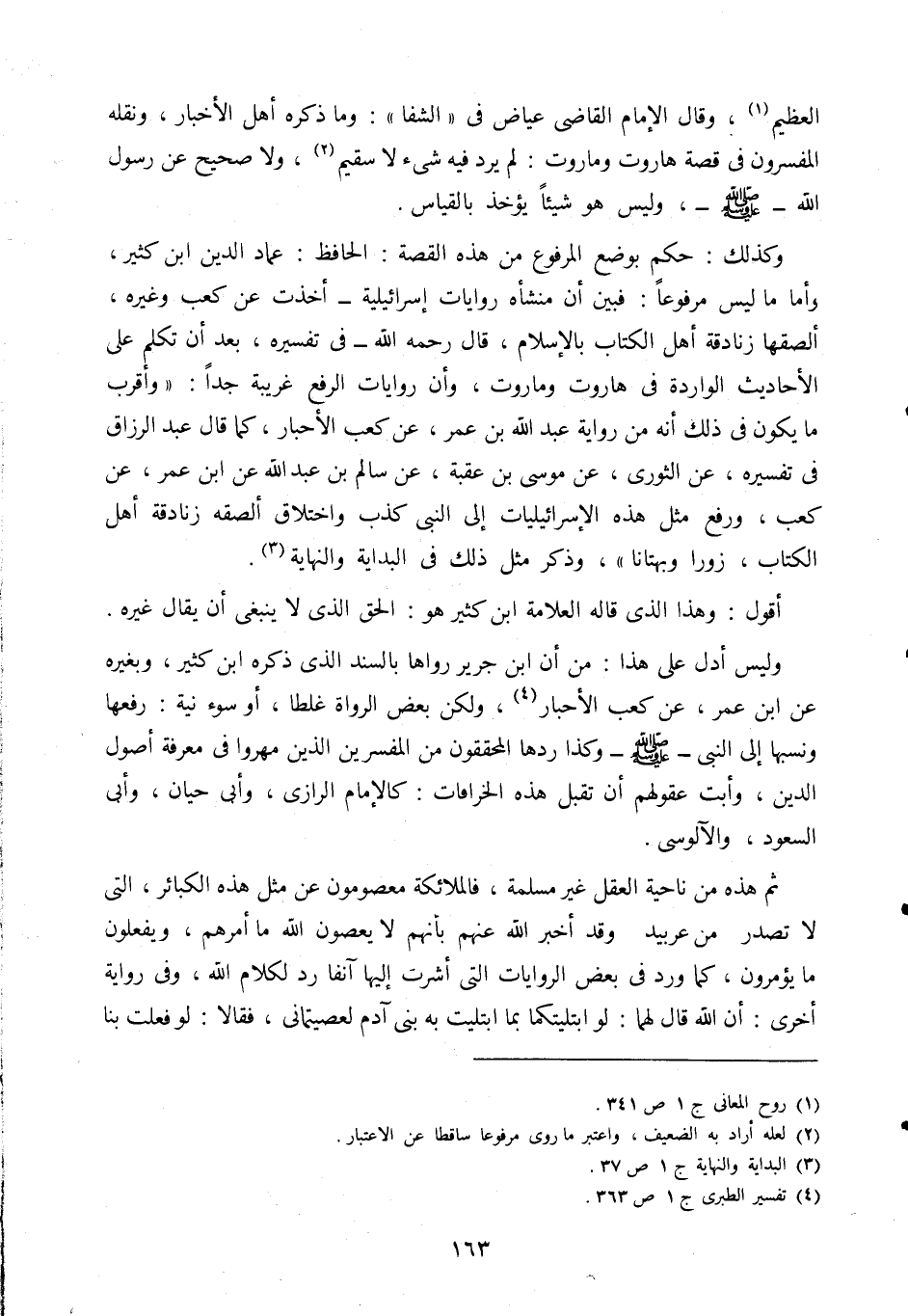 العظيم1، وقال الإمام القاضي عياض في "الشفاء"، وما ذكره أهل الأخبار، ونقله المفسرون في قصة هاروت وماروت: لم يرد فيه شيء لا سقيم2، ولا صحيح عن رسول الله صلى الله عليه وسلم وليس هو شيئًا يؤخذ بالقياس.