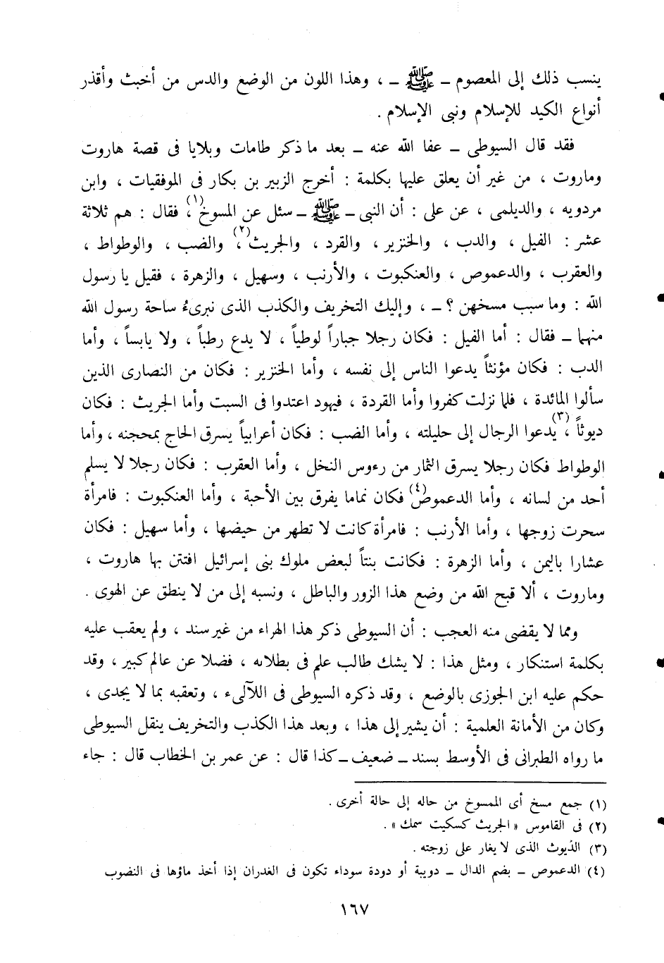 فقد قال السيوطي عفا الله عنه بعد ما ذكر طامات وبلايا في قصة هاروت وماروت، من غير أن يعلق عليها بكلمة؛ أخرج الزبير بن بكار في الموفقيات، وابن مردويه، والديلمي، عن علي: أن النبي صلى الله عليه وسلم سئل عن المسوخ1 فقال: هم ثلاثة عشر: الفيل، والدب، والخنزير، والقرد، والجريث2، والضب، والوطواط، والعقرب، والدعموص، والعنكبوت، والأرنب، وسهيل، والزهر، فقيل: يا رسول الله وما سبب مسخهن؟ وإليك التخريف والكذب الذي نبرئ ساحة رسول الله منهما فقال: أما الفيل: فكان رجلًا جبارًا لوطيا، لا يدع رطبا، ولا يابسا، وأما الدب: فكان مؤنثًا يدعو الناس إلى نفسه، وأما الخنزير: فكان من النصارى الذين سألوا المائدة، فلما نزلت كفروا، وأما القردة: فيهود اعتدوا في السبت، وأما الجريث: فكان ديوثا3، يدعو الرجال إلى حليلته، وأما الضب: فكان أعرابيا يسرق الحاج بمحجنه، وأما الوطواط: فكان رجلا يسرق الثمار من رءوس النخل، وأما العقرب: فكان رجلا لا يسلم أحد من لسانه، وأما الدعموص4: فكان نَمَّامًا يُفَرق بين الأحبة، وأما العنكبوت: فامرأة سحرت زوجها، وأما الأرنب: فإمرأة كانت لا تطهر من حيضها، وأما سهيل: فكان عشَّارًا باليمن، وأما الزهرة: فكانت بنتا لبعض ملوك بني إسرائيل افتتن بها هاروت، وماروت؛ ألا قبَّح الله من وضع هذا الزور والباطل، ونسبه إلى من لا ينطق عن الهوى.