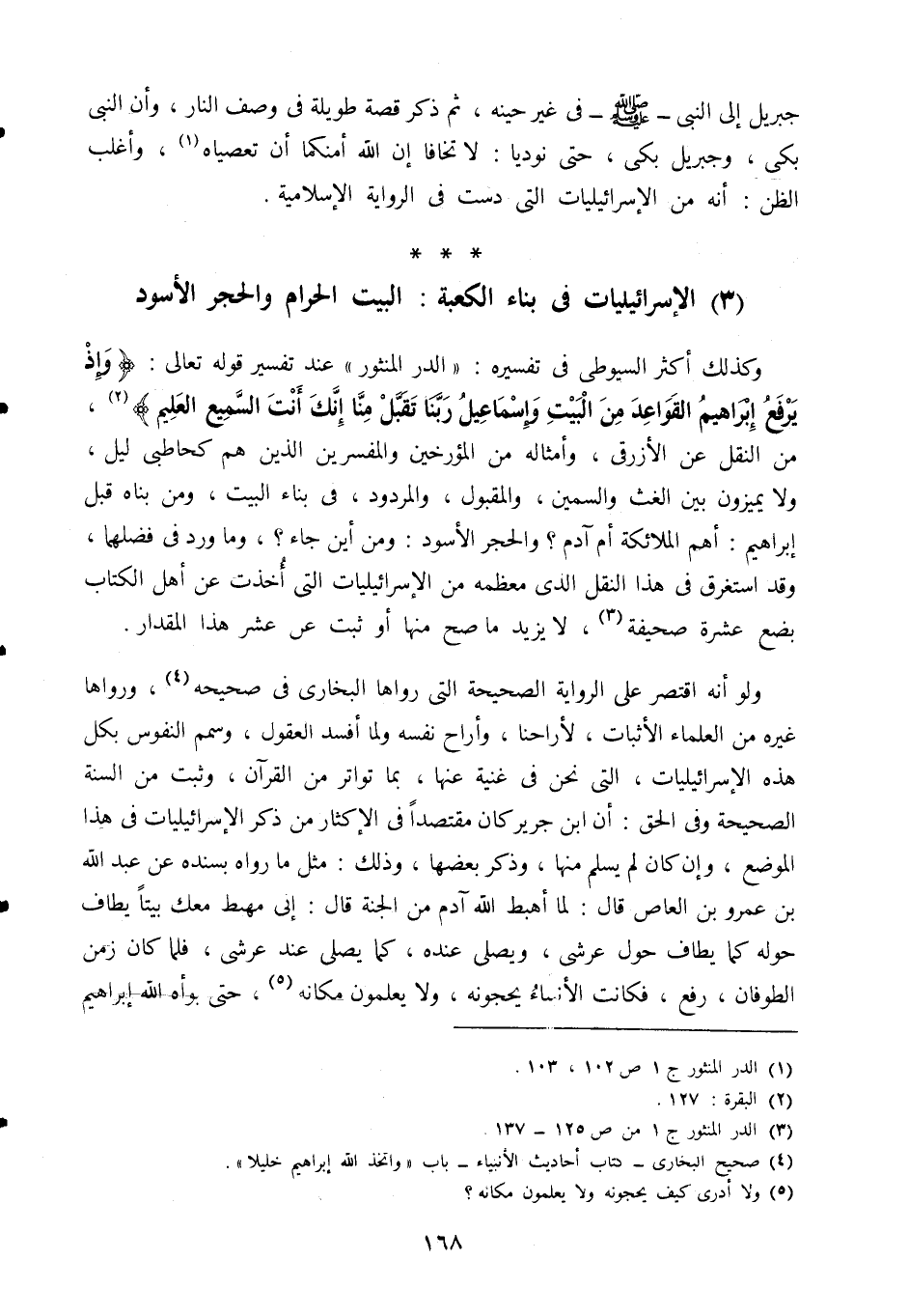 وكذلك أكثَرَ السيوطي في تفسيره: "الدر المنثور" عند تفسير قوله تعالى: {وَإِذْ يَرْفَعُ إِبْرَاهِيمُ الْقَوَاعِدَ مِنَ الْبَيْتِ وَإِسْمَاعِيلُ رَبَّنَا تَقَبَّلْ مِنَّا إِنَّكَ أَنْتَ السَّمِيعُ الْعَلِيمُ} 1، من النقل عن الأزرقي، وأمثاله من المؤرخين والمفسرين الذين هم كحاطبي ليل، ولا يميزون بين الغث والسمين، والمقبول، والمردود، في بناء البيت، ومن بناه قبل إبراهيم: أهم الملائكة أم آدم؟ والحجر الأسود ومن أين جاء؟ وما ورد في فضلهما، وقد استغرق في هذا النقل الذي معظمه من الإسرائيليات التي أخذت عن أهل الكتاب بضع عشرة صحيفة2، لا يزيد ما صح منها أو ثبت عن عُشْرِ هذا المقدار.