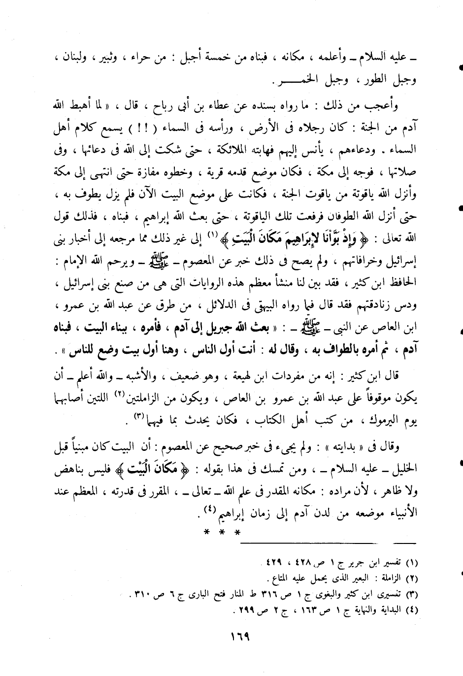 وأعجب من ذلك: ما رواه بسنده عن عطاء بن أبي رباح، قال: لما أهبط الله آدم من الجنة: كان رجلاه في الأرض، ورأسه في السماء!! يسمع كلام أهل السماء ودعاءهم، يأنس إليهم فهابته الملائكة، حتى شكت إلى الله في دعائها، وفي صلاتها، فوجه إلى مكة، فكان موضع قدمه قرية وخطوه مفازة حتى انتهى إلى مكة وأنزل الله ياقوتة من ياقوت الجنة، فكانت على موضع البيت الآن فلم يزل يطوف به، حتى أنزل الله الطوفان فرفعت تلك الياقوتة، حتى بعث الله إبراهيم، فبناه، فذلك قول الله تعالى: {وَإِذْ بَوَّأْنَا لِإِبْرَاهِيمَ مَكَانَ الْبَيْتِ} 1 إلى غير ذلك مما مرجعه إلى أخبار بني إسرائيل وخرافاتهم، ولم يصح في ذلك خبر عن المعصوم صلى الله عليه وسلم، ويرحم الله الإمام الحافظ ابن كثير؛ فقد بين لنا منشأ معظم هذه الروايات التي هي من صنع بني إسرائيل، ودس زنادقتهم، فقد قال فيما رواه البيهقي في الدلائل من طرق عن عبد الله بن عمرو ابن العاص عن النبي صلى الله عليه وسلم: "بعض الله جبريل إلى آدم، فأمره، ببناء البيت، فبناه آدم، ثم أمره بالطواف به، وقال له: أنت أول الناس، وهنا أول بيت وضع اللناس".
