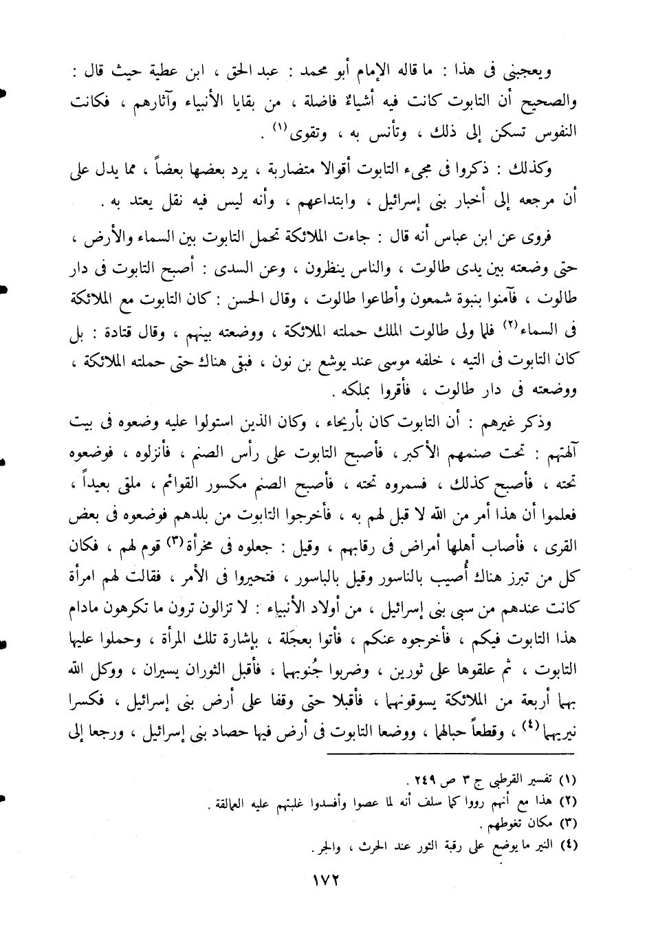 وكذلك: ذكروا في مجيء التابوت أقوالا متضاربة، يرد بعضها بعضًا، مما يدل على أن مرجعه إلى أخبار بني إسرائيل، وابتداعهم، وأنه ليس فيه نقل يعتدُّ به.