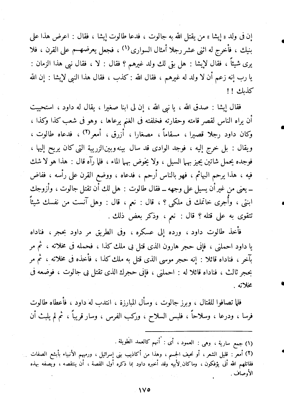إن في ولد "إيشا" من يقتل الله به جالوت، فدعا طالوت إيشا، فقال: اعرض هذا على بنيك، فأخرج له اثنى عشر رجلا أمثال السواري1، فجعل يعرضهم على القرن، فلا يرى شيئا فقال لإيشا: هل بقي لك ولد غيرهم؟ فقال: لا فقال نبي هذا الزمان: يا رب إنه زعم أن لا ولد له غيرهم، فقال الله: كذب، فقال هذا النبي لإيشا: إن الله كذبك!!