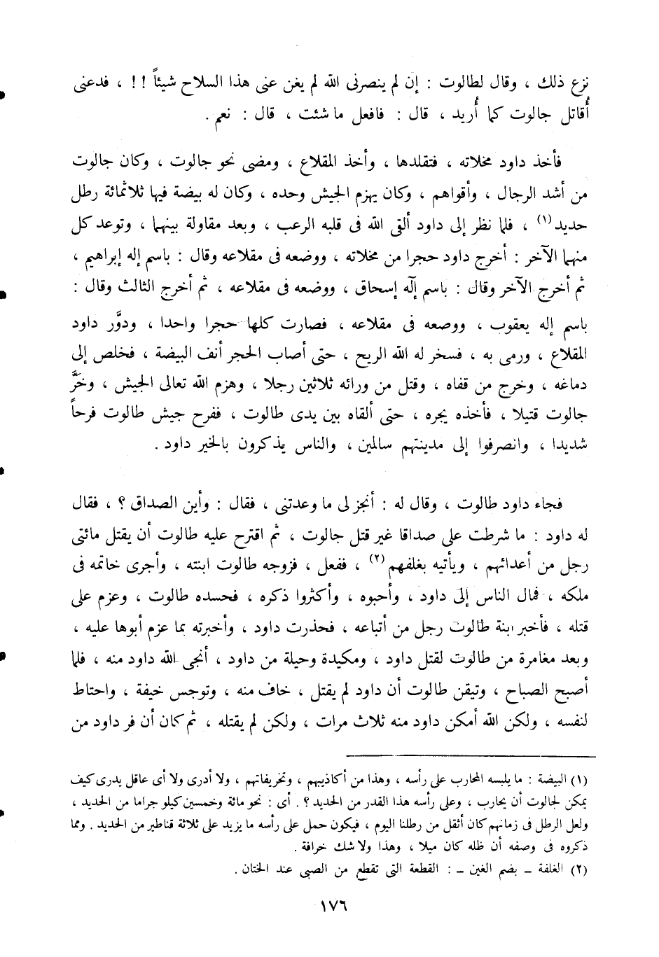 نزع ذلك، وقال لطالوت: إن لم ينصرني الله لم يغنِ عني هذا السلاح شيئا!!، فدعني أقاتل جالوت كما أريد، قال: فافعل ما شئت، قال: نعم.