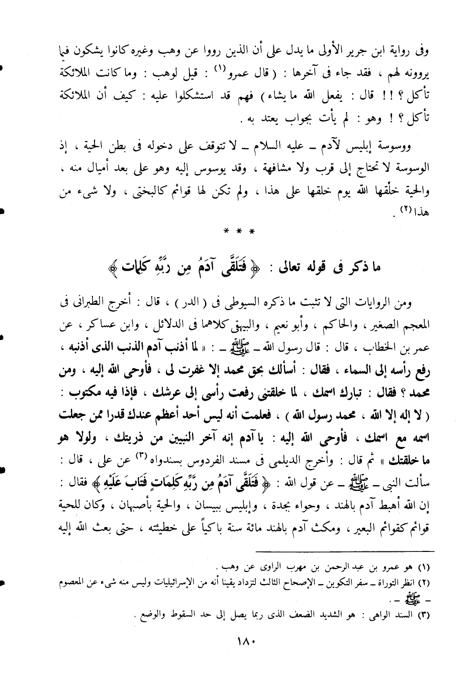 2 انظر التوراة، سفر التكوين، الإصحاح الثالث؛ لتزداد يقينا أنه من الإسرائيليات وليس منه شيء عن المعصوم صلى الله عليه وسلم.