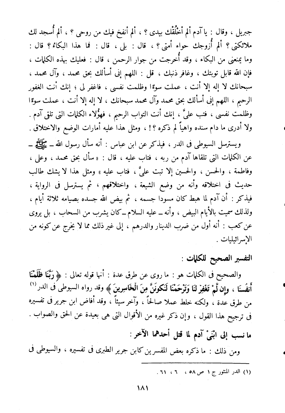 والصحيح في الكلمات هو: ما روي عن طرق عدة: أنها قوله تعالى: {رَبَّنَا ظَلَمْنَا أَنْفُسَنَا وَإِنْ لَمْ تَغْفِرْ لَنَا وَتَرْحَمْنَا لَنَكُونَنَّ مِنَ الْخَاسِرِينَ} وقدر واه السيوطي في الدر1 من طرق عدة، ولكنه خلط عملا صالحا، وآخر سيئا، وقد أفاض ابن جرير في تفسيره في ترجيح هذا القول، وإن ذكر غيره من الأقوال التي هي بعيدة عن الحق والصواب.