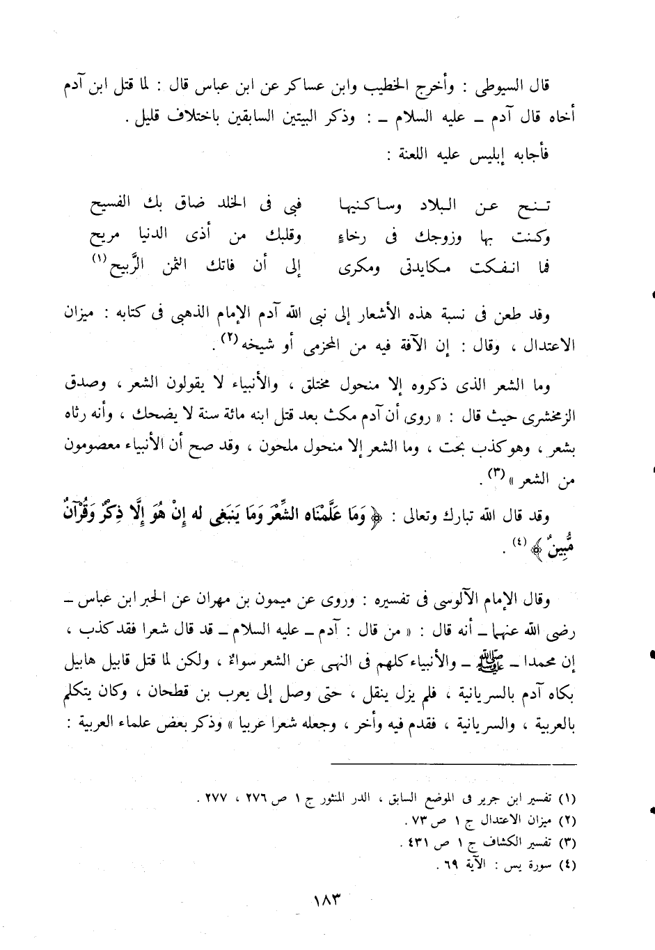 وما الشعر الذي ذكروه إلا منحول مختلق، والأنبياء لا يقولون الشعر، وصدق الزمخشري حيث قال: "روي أن آدم مكث بعد قتل ابنه مائة سنة لا يضحك، وأنه رثاه بشعر، وهو كذب بحت، وما الشعر إلا منحول ملحون، وقد صح أن الأنبياء معصومون من الشعر"3.