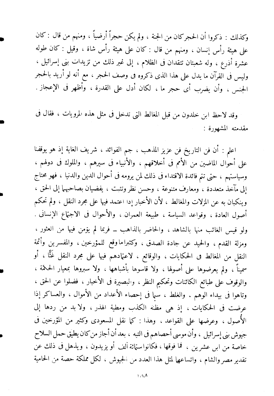 اعلم: أن فن التاريخ فن عزيز المذهب، جم الفوائد، شريف الغاية إذ هو يوقفنا على أحوال الماضين من الأمم في أخلاقهم، والأنبياء في سيرهم، والملوك في دولهم، وسياستهم، حتى تتم فائدة الاقتداء في ذلك لمن يرومه في أحوال الدين والدنيا، فهو محتاج إلى مآخذ متعددة، ومعارف متنوعة، وحسن نظر وتثبُّت، يفضيان بصاحبهما إلى الحق، وينكبان به عن المزلات والمغالط؛ لأن الأخبار إذا اعتمد فيها على مجرد النقل، ولم تحكم أصول العادة، وقواعد السياسة، طبيعة العمران، والأحوال في الاجتماع الإنساني. ولو قيس الغائب منها بالشاهد، والحاضر بالذاهب فربما لم يؤمن فيها من العثور، ومزلَّة القدم، والحيد عن جادة الصدق، وكثيرا ما وقع للمؤرخين، والمفسرين وأئمة النقل من المغالط في الحكايات، والوقائع، لاعتمادهم فيها على مجرد النقل غثا، أو سمينا، ولم يعرضوها على أصولها، ولا قاسوها بأشباهها، ولا سبروها بمعيار الحكمة، والوقوف على طبائع الكائنات وتحكيم النظر، والبصيرة في الأخبار فضلُّوا عن الحق، وتاهوا في بيداء الوهم، والغلط، سيما في إحصاء الأعداد من الأموال، والعساكر إذا عرضت في الحكايات؛ إذ هي مظنة الكذب ومطية الهذر، ولا بد من ردها إلى الأصول، وعرضها على القواعد، وهذا: كما نقل المسعودي وكثير من المؤرخين في جيوش بني إسرائيل، وأن موسى أحصاهم في التيه، بعد أن أجاز من كان يطيق حمل السلاح خاصة من ابن عشرين، فما فوقها، فكانوا ستمائة ألف أو يزيدون، ويذهل في ذلك عن تقدير مصر والشام، واتساعها لمثل هذا العدد من الجيوش، لكل مملكة حصة من الحامية.