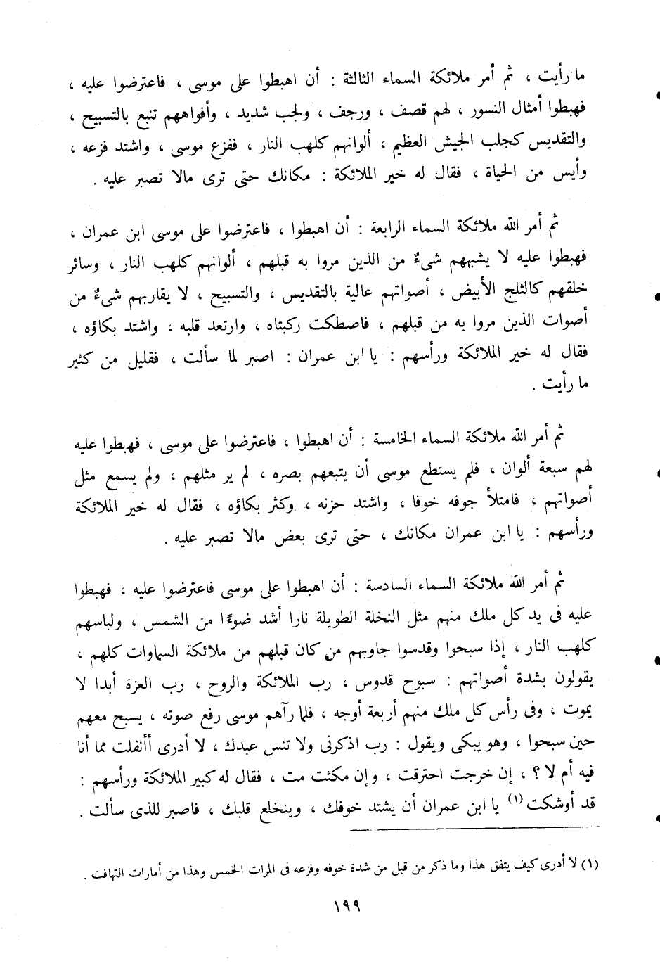 ما رأيت، ثم أمر ملائكة السماء الثالثة: أن اهبطوا على موسى فاعترضوا عليه، فهبطوا أمثال النسور، لهم قصف ورجف، ولجب شديد، وأفواههم تنبع بالتسبيح، والتقديس كجلب الجيش العظيم، ألوانهم كلهب النار، ففزع موسى، واشتد فزعه، وأيس من الحياة، فقال له خير الملائكة: مكانك حتى ترى ما لا تصبر عليه. ثم أمر الله ملائكة السماء الرابعة: أن اهبطوا، فاعترضوا على موسى بن عمران، فهبطوا عليه لا يشبههم شيء من الذين مروا به قبلهم، ألوانهم كلهب النار، وسائر خلقهم كالثلج الأبيض، أصواتهم عالية بالتقديس، والتسبيح، لا يقاربهم شيء من أصوات الذين مروا به من قبلهم، فاصطكت ركبتاه، وارتعد قلبه، واشتد بكاؤه، فقال له خير الملائكة ورأسهم: يا ابن عمران: اصبر لما سألت، فقليل من كثير ما رأيت.
