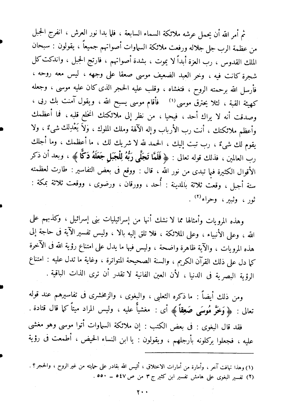 ثم أمر الله أن يحمل عرشه ملائكة السماء السابعة، فلما بدا نور العرش، انفرج الجبل من عظمة الرب جلا جلاله، ورفعت ملائكة السماوات أصواتهم جميعا، يقولون: سبحان الملك القدوس، رب العزة أبدا لا يموت، بشدة أصواتهم، فارتج الجبل، واندكت كل شجرة كانت فيه، وخر العبد الضعيف موسى صعقا على وجهه، ليس معه روحه، فأرسل الله برحمته الروح، فتغشاه، وقلب عليه الحجر الذي كان عليه موسى، وجعله كهيئة القبة؛ لئلا يحترق موسى1 فأقام موسى يسبح الله، ويقول: آمنت بك ربي، وصدقت أنه لا يراك أحد فيحيا، من نظر إلى ملائكتك انخلع قلبه، فما أعظمك وأعظم ملائكتك، أنت رب الأرباب وإله الآلهة وملك الملوك، ولا يعدلك شيء، ولا يقوم لك شيء، ربِّ تُبْتُ إليك، الحمد لله لا شريك لك، ما أعظمك، وما أجللك رب العالمين، فذلك قوله تعالى: {فَلَمَّا تَجَلَّى رَبُّهُ لِلْجَبَلِ جَعَلَهُ دَكًّا} ، وبعد أن ذكر الأقوال الكثيرة فيما تبدى من نور الله، قال: ووقع في بعض التفاسير: طارت لعظمته ستة أجبل، وقعت ثلاثة بالمدينة: أحد، وورقان ورضوى، ووقعت ثلاثة بمكة: ثور، وثبير، وحراء2.