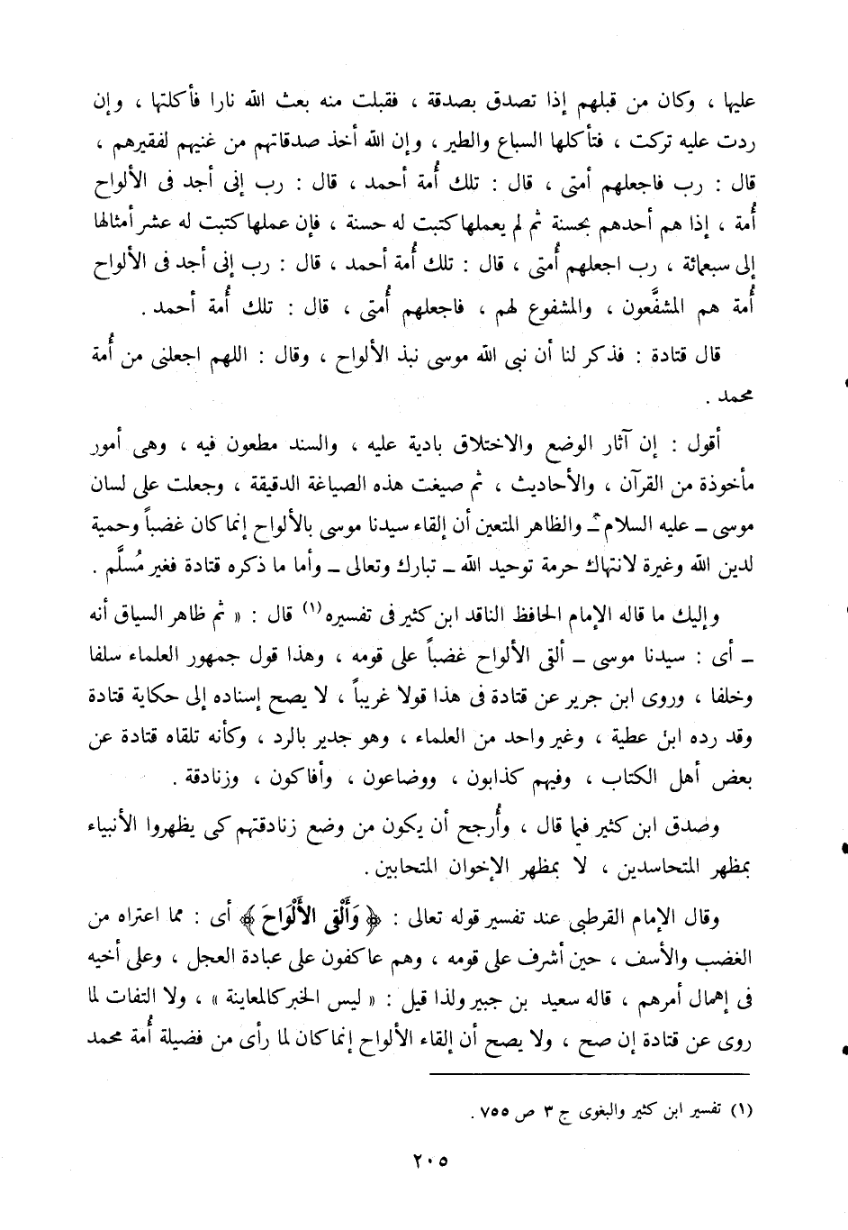 وقال الإمام القرطبي عند تفسير قوله تعالى: {وَأَلْقَى الْأَلْوَاحَ} أي: مما اعتراه من الغضب والأسف، حين أشرف على قومه، وهم عاكفون على عبادة العجل، وعلى أخيه في إهمال أمرهم، قاله سعيد بن جبير ولذا قيل: "ليس الخبر كالمعاينة"، ولا التفات لما روي عن قتادة إن صح، ولا يصح أن إلقاء الألواح إنما كان لما رأى من فضيلة أمة محمد.
