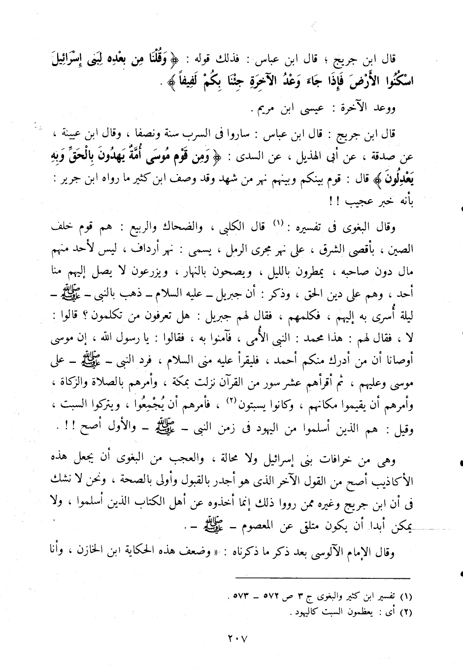 وقال البغوي في تفسيره1: قال الكلبي، والضحاك، والربيع: هم قوم خلف الصين، بأقصى الشرق، على نهر مجرى الرمل، يسمى: نهر أرداف، ليس لأحد منهم مال دون صاحبه، يمطرون بالليل، ويصحون بالنهار، ويزرعون لا يصل إليهم منا أحد، وهم على دين الحق، وذكر أن جبريل عليه السلام ذهب بالنبي صلى الله عليه وسلم ليلة أُسرِي به إليهم، فكلمهم، فقال لهم جبريل: هل تعرفون من تكلمون؟ قالوا: لا، فقال لهم: هذا محمد؛ النبي الأمي، فآمنوا به، فقالوا: يا رسول الله، إن موسى أوصانا أن من أدرك منكم أحمد، فليقرأ عليه مني السلام، فردَّ النبي صلى الله عليه وسلم على موسى وعليهم، ثم أقرأهم عشر سور من القرآن نزلت بمكة، وأمرهم بالصلاة والزكاة، وأمرهم أن يقيموا مكانهم، وكانوا يسبتون2، فأمرهم أن يجمعوا، ويتركوا السبت، وقيل: هم الذين اسلموا من اليهود في زمن النبي صلى الله عليه وسلم والأول أصح!!