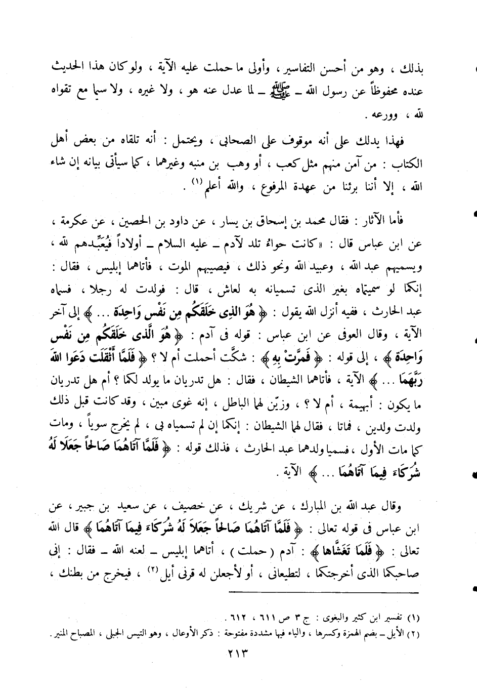 فأما الآثار، فقال محمد بن إسحاق بن يسار، عن داود بن الحصين، عن عكرمة، عن ابن عباس قال: "كانت حواء تلد لآدم عليه السلام أولادا فيعبدهم لله ويسميهم عبد الله، وعبيد الله ونحو ذلك، فيصيبهم الموت، فأتاهما إبليس، فقال: إنما لو سميتماه بغير الذي تسميانه به لعاش، قال: فولدت له رجلا، فسماه عبد الحارث، ففيه أنزل الله يقول: {هُوَ الَّذِي خَلَقَكُمْ مِنْ نَفْسٍ وَاحِدَة} إلى آخر الآية، وقال العوفي عن ابن عباس: قوله في آدم: {هُوَ الَّذِي خَلَقَكُمْ مِنْ نَفْسٍ وَاحِدَة} إلى قوله: {فَمَرَّتْ بِه} شكَّت أحملت أم لا؟ {فَلَمَّا أَثْقَلَتْ دَعَوَا اللَّهَ رَبَّهُمَا} الآية، فأتاهما الشيطان، فقال: هل تدريان ما يولد لكما؟ أم هل تدريان ما يكون أبهيمة أم لا؟ وزين لهما الباطل، إنه غوي مبين، وقد كانت قبل ذلك ولدت ولدين فماتا فقال لهما الشيطان: إنكما لم تسمياه بي، لم يخرج سويا ومات كما مات الأول، فسميا ولدهما عبد الحارث، فذلك قوله: {فَلَمَّا آتَاهُمَا صَالِحًا جَعَلا لَهُ شُرَكَاءَ فِيمَا آتَاهُمَا} الآية.