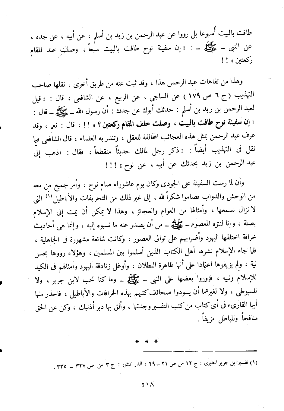 وهذا من تفاهات عبد الرحمن هذا، وقد ثبت عنه من طريق أخرى، نقلها صاحب التهذيب "ج 6 ص 179" عن الساجي، عن الربيع، عن الشافعي، قال: "قيل لعبد الرحمن بن زيد بن أسلم: حدثك أبوك عن جدك: أن رسول الله صلى الله عليه وسلم قال: "إن سفينة نوح طافت بالبيت، وصلت خلف المقام ركعتين؟ "!! قال: نعم، وقد عرف عبد الرحمن بمثل هذه العجائب المخالفة للعقل وتندر به العلماء، قال الشافعي فيما نقل في التهذيب أيضا: "ذكر رجل لمالك حديثا منقطعا، فقال: اذهب إلى عبد الرحمن بن زيد يحدثك عن أبيه، عن نوح"!!