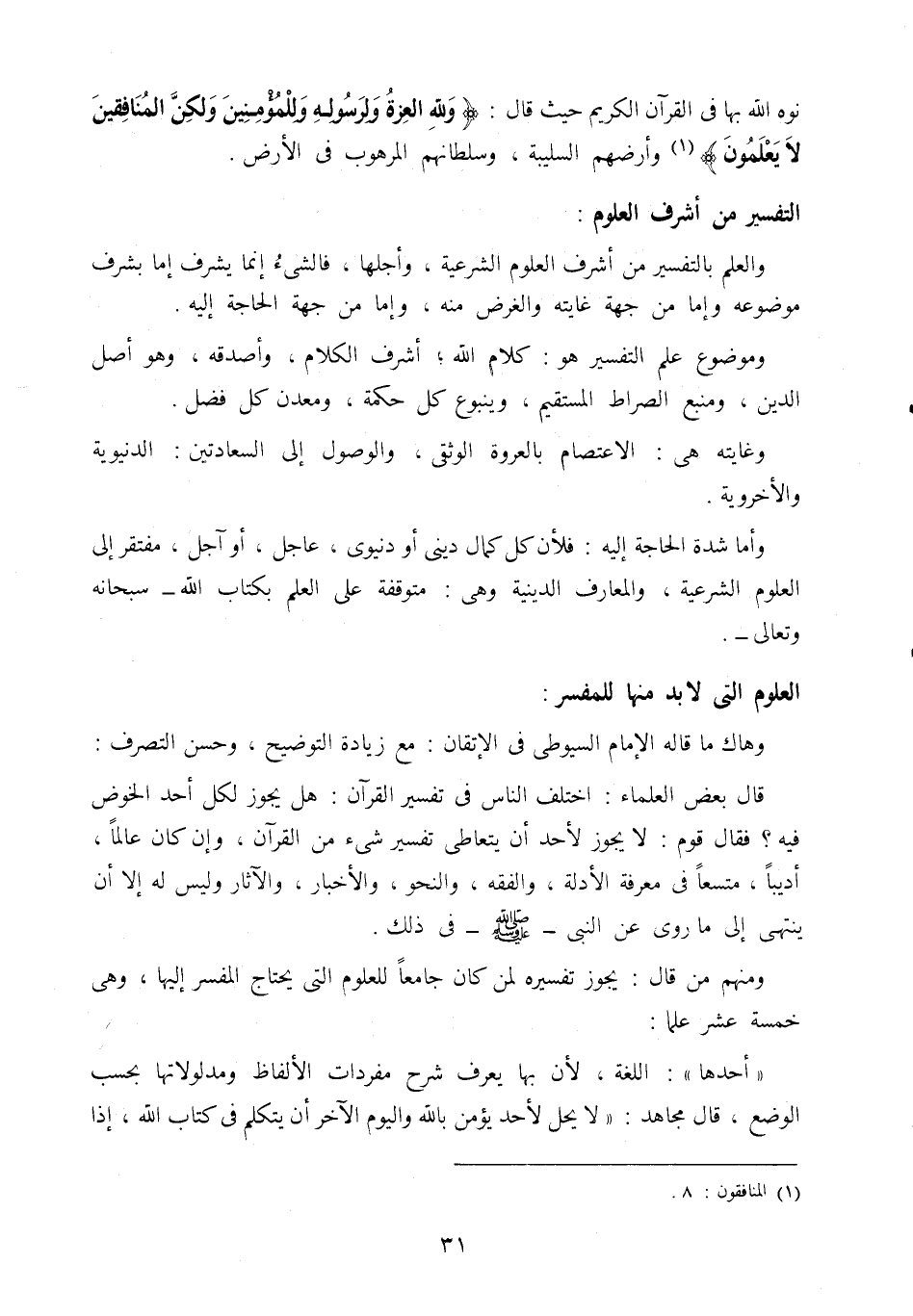 والعلم بالتفسير من أشرف العلوم الشرعية، وأجلها؛ فالشيء إنما يشرف إما بشرف موضوعه وإما من جهة غايته والغرض منه، وإما من جهة الحاجة إليه.
