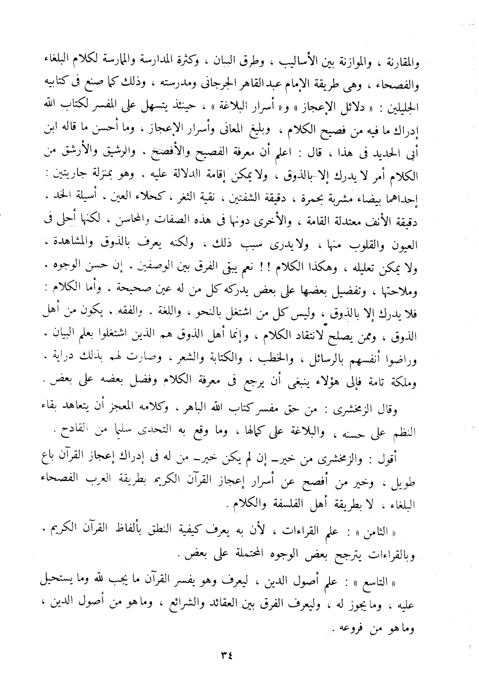 "التاسع": علم أصول الدين؛ ليعرف وهو يفسر القرآن ما يجب لله وما يستحيل عليه، وما يجوز له، وليعرف الفرق بين العقائد والشرائع، وما هو من أصول الدين، وما هو من فروعه.