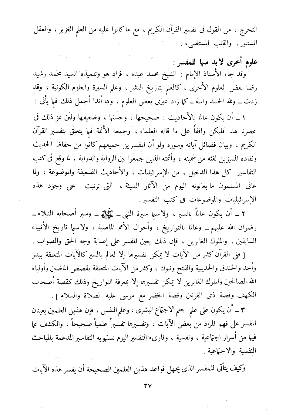 3- أن يكون على علم بعلم الاجتماع البشري، وعلم النفس؛ فإن هذين العلمين يعينان المفسر على فهم المراد من بعض الآيات، وتفسيرها تفسيرًا علميا صحيحا، والكشف عما فيها من أسرار اجتماعية، ونفسية، وقارئ التفسير اليوم تستهويه التفاسير المدعمة بالمباحث النفسية والاجتماعية.