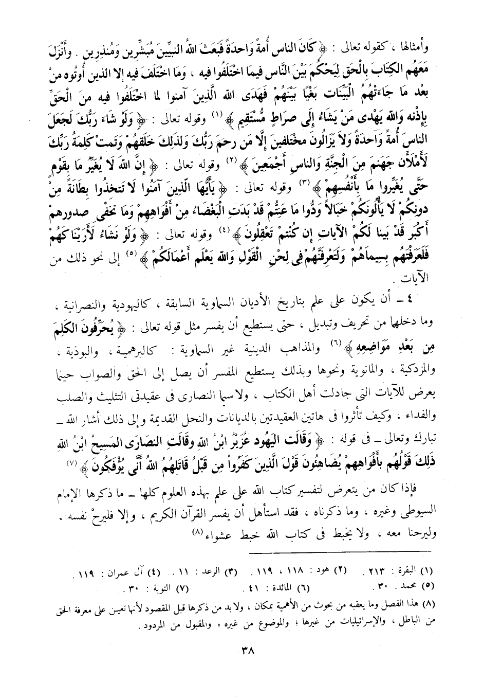 4- أن يكون على علم بتاريخ الأديان السماوية السابقة، كاليهودية والنصرانية، وما دخلهما من تحريف وتبديل، حتى يستطيع أن يفسر قوله تعالى: {يُحَرِّفُونَ الْكَلِمَ عَنْ مَوَاضِعِه} 6، والمذاهب الدينية غير السماوية: كالبرهمية، والبوذية، والمزدكية، والمانوية ونحوها، وبذلك يستطيع المفسر أن يصل إلى الحق والصواب حينما يعرض للآيات التي جادلت أهل الكتاب، ولا سيما النصارى في عقيدتي التثليث والصلب والفداء، وكيف تأثروا في هاتين العقيدتين بالديانات والنحل القديمة وإلى ذلك أشار الله تبارك وتعالى في قوله: {وَقَالَتِ الْيَهُودُ عُزَيْرٌ ابْنُ اللَّهِ وَقَالَتِ النَّصَارَى الْمَسِيحُ ابْنُ اللَّهِ ذَلِكَ قَوْلُهُمْ بِأَفْوَاهِهِمْ يُضَاهِئُونَ قَوْلَ الَّذِينَ كَفَرُوا مِنْ قَبْلُ قَاتَلَهُمُ اللَّهُ أَنَّى يُؤْفَكُونَ} 7.