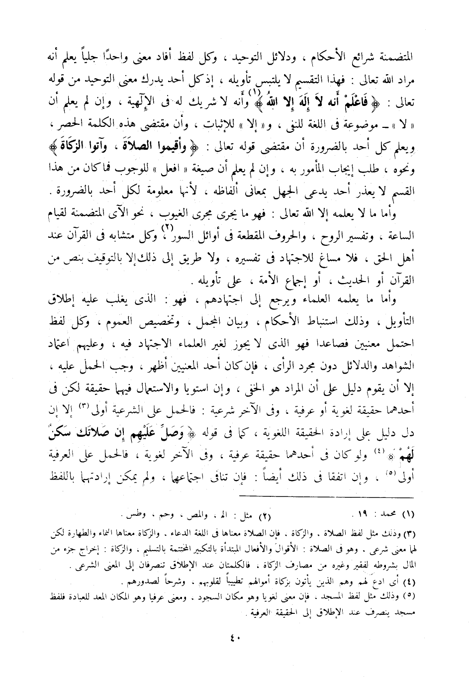 المتضمنة شرائع الأحكام، ودلائل التوحيد، وكل لفظ أفاد معنى واحدا جليا يعلم أنه مراد الله تعالى: فهذا التقسيم لا يلتبس تأويله؛ إذ كل أحد يدرك معنى التوحيد من قوله تعالى: {فَاعْلَمْ أَنَّهُ لا إِلَهَ إِلَّا اللَّهُ} 1، وأنه لا شريك له في الإلهية، وإن لم يعلم أن "لا" موضوعة في اللغة للنفي و"إلا" للإثبات، وأن مقتضى هذه الكلمة الحصر، ويعلم كل أحد بالضرورة أن مقتضى قوله تعالى: {وَأَقِيمُوا الصَّلاةَ وَآتُوا الزَّكَاةَ} ونحوه، طلب إيجاب المأمور به، وإن لم يعلم أن صيغة "افعل" للوجوب فما كان من هذا القسم لا يعذر أحد يدعى الجهل بمعاني ألفاظه؛ لأنها معلومة لكل أحد بالضرورة. وأما ما لا يعلمه إلا الله تعالى: فهو ما يجري مجرى الغيوب، نحو الآي المتضمنة لقيام الساعة، وتفسير الروح، والحروف المقطعة في أوائل السور،2 وكل متشابه في القرآن عند أهل الحق، فلا مساغ للاجتهاد في تفسيره، ولا طريق إلى ذلك إلا بالتوقيف بنص من القرآن أو الحديث، أو إجماع الأمة، على تأويله.
