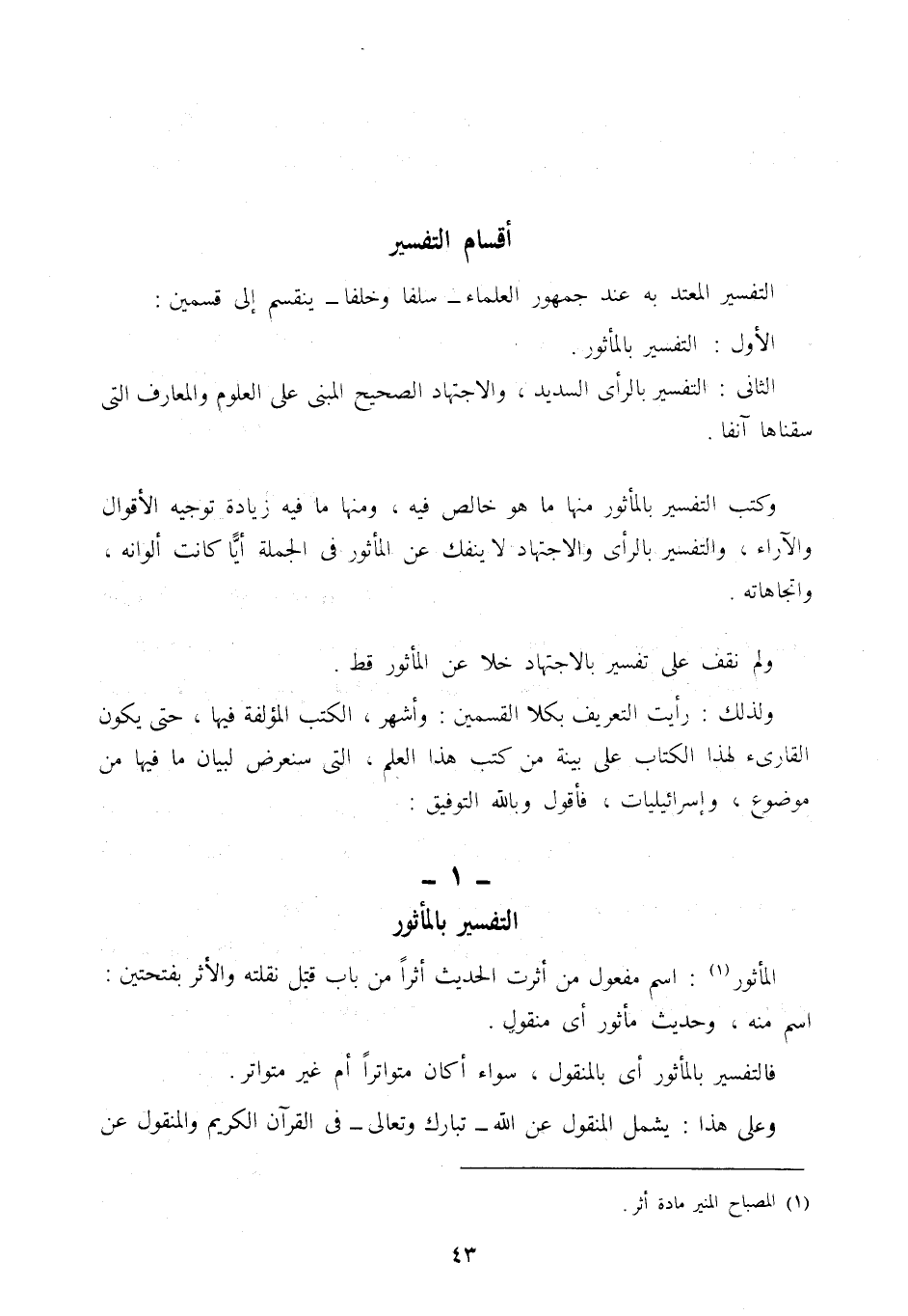 التفسير المعتدُّ به عند جمهور العلماء سلفا وخلفا ينقسم إلى قسمين الأول: التفسير بالمأثور.