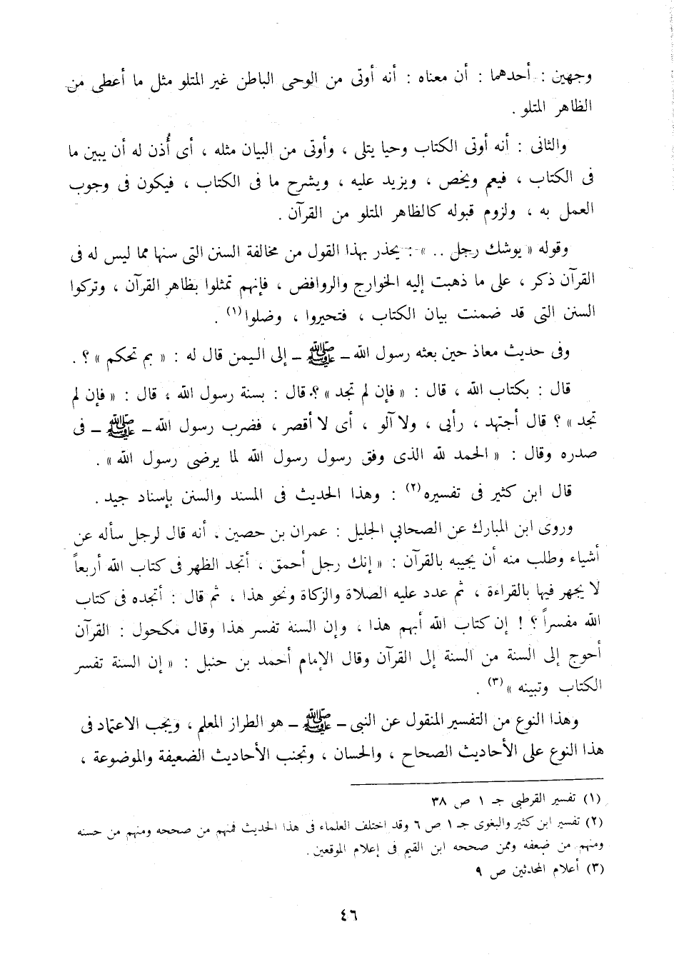 2 تفسير ابن كثير والبغوي جـ1 ص 6، وقد اختلف العلماء في هذا الحديث؛ فمنهم من صححه ومنهم من حسنه ومنهم من ضعفه وممن صححه ابن القيم في إعلام الموقعين.
