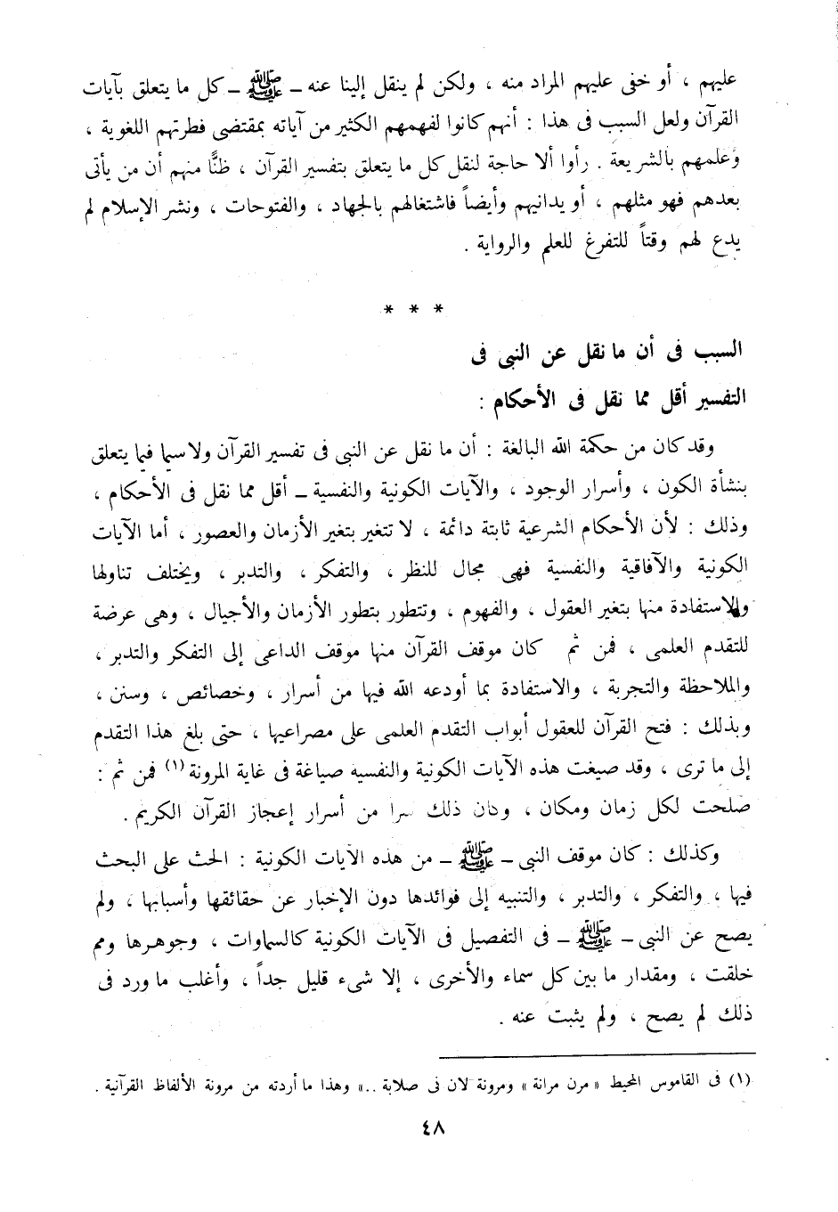 وقد كان من حكمة الله البالغة: أن ما نقل عن النبي في تفسير القرآن ولا سيما فيما يتعلق بنشأة الكون، وأسرار الوجود، والآيات الكونية والنفسية أقل مما نقل في الأحكام؛ وذلك لأن الأحكام الشرعية ثابتة دائمة، لا تتغير بتغير الأزمان والعصور، أما الآيات الكونية والآفاقية والنفسية فهي مجال للنظر، والتفكر، والتدبر، ويختلف تناولها والاستفادة منها بتغير العقول، والفهوم، وتتطور بتطور الأزمان والأجيال، وهي عرضة للتقدم العلمي، فمن ثم كان موقف القرآن منها موقف الداعي إلى التفكر والتدبر، والملاحظة والتجربة والاستفادة بما أودعه الله فيها من أسرار، وخصائص، وسنن؛ وبذلك فتح القرآن للعقول أبواب التقدم العلمي على مصراعيها، حتى بلغ هذا التقدم إلى ما ترى وقد صيغت هذه الآيات الكونية والنفسية صياغة في غاية المرونة1، فمن ثم صلحت لكل زمان ومكان، وكان ذلك سرًّا من أسرار إعجاز القرآن الكريم.
