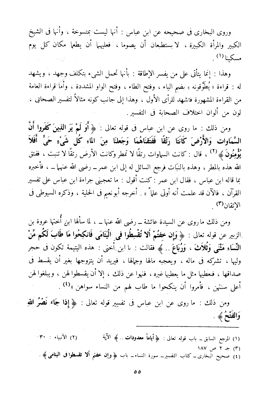 وهذا: إنما يتأتى على من يفسر الإطاقة: بأنها تحمل الشيء بتكلف وجهد، ويشهد له: قراءة "يُطَوَّقُونَه" بضم الياء، وفتح الطاء، وفتح الواو المشددة، وأما قراءة العامة من القراءة المشهورة فتشهد للرأي الأول، وهذا إلى جانب كونه مثالا لتفسير الصحابي، لون من ألوان اختلاف الصحابة في التفسير.
