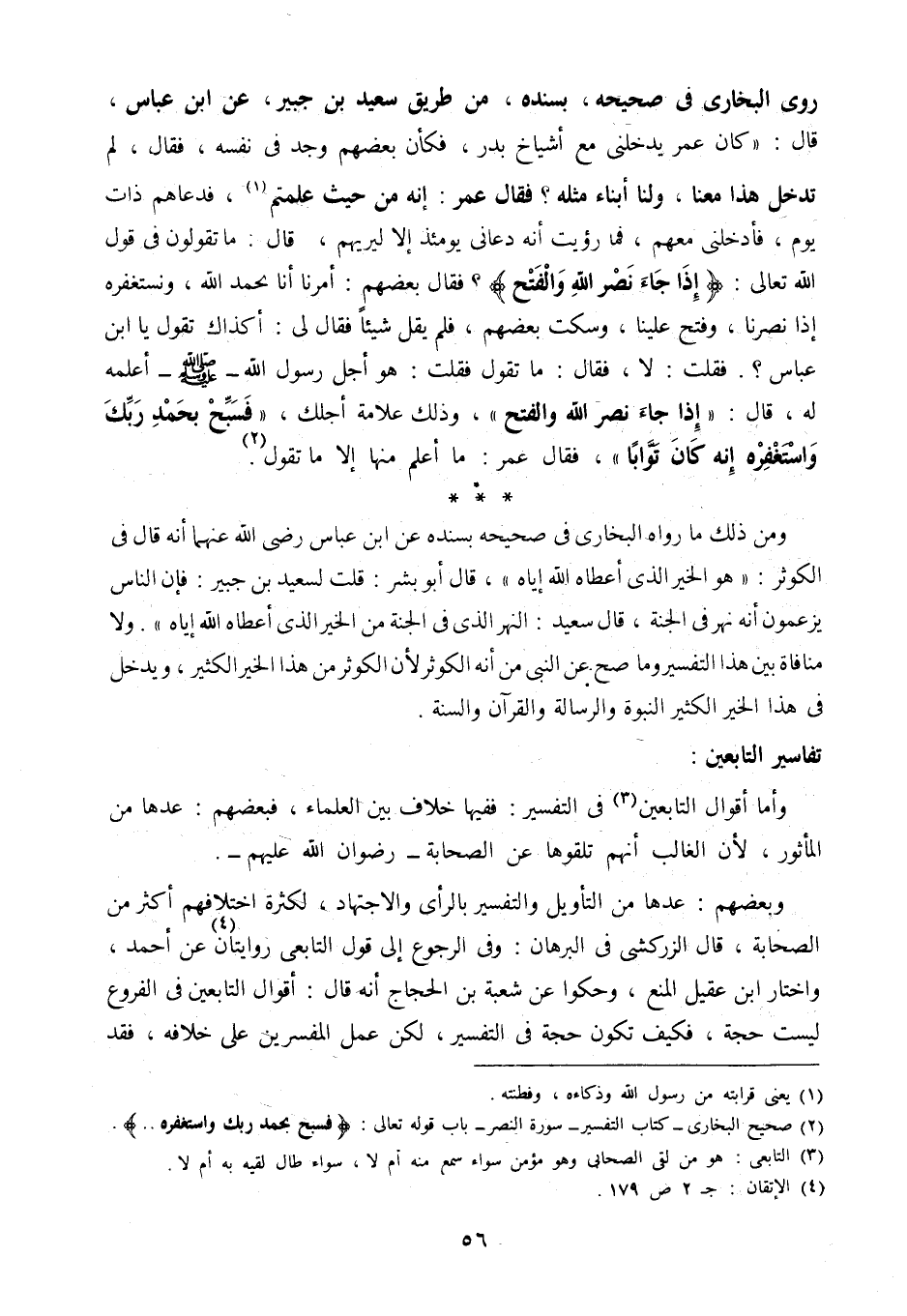 ومن ذلك ما رواه البخاري في صحيحه بسنده عن ابن عباس رضي الله عنهما أنه قال في الكوثر: هو الخير الذي أعطاه الله إياه" قال أبو بشر: قلت لسعيد بن جبير: فإن الناس يزعمون أنه نهر في الجنة، قال سعيد: النهر الذي في الجنة من الخير الذي أعطاه الله إياه". ولا منافاة بين هذا التفسير وما صح عن النبي من أنه الكوثر؛ لأن الكوثر من هذا الخير الكثير، ويدخل في هذا الخير الكثير النبوة والرسالة والقرآن والسنة.