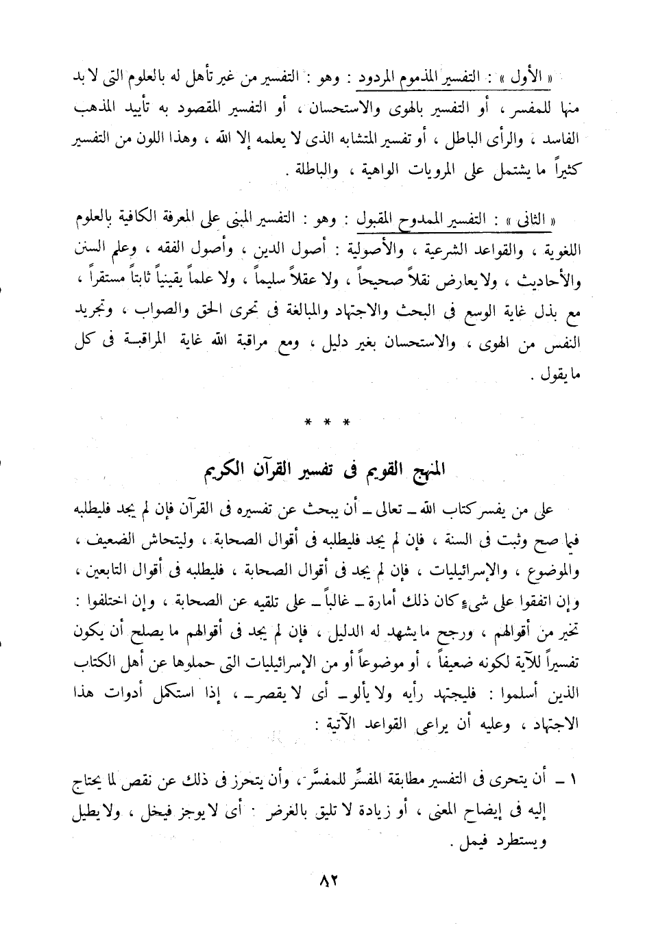 الثاني: التفسير الممدوح المقبول: وهو التفسير المبني على المعرفة الكافية بالعلوم اللغوية، والقواعد الشرعية، والأصولية: أصول الدين، وأصول الفقه، وعلم السنن والأحاديث، ولا يعارض نقلا صحيحا، ولا عقلا سليما، ولا علما يقينا ثابتا مستقرا، مع بذل غاية الوسع في البحث والاجتهاد والمبالغة في تحري الحق والصواب، وتجريد النفس من الهوى، والاستحسان بغير دليل، ومع مراقبة الله غاية المراقبة في كل ما يقول.