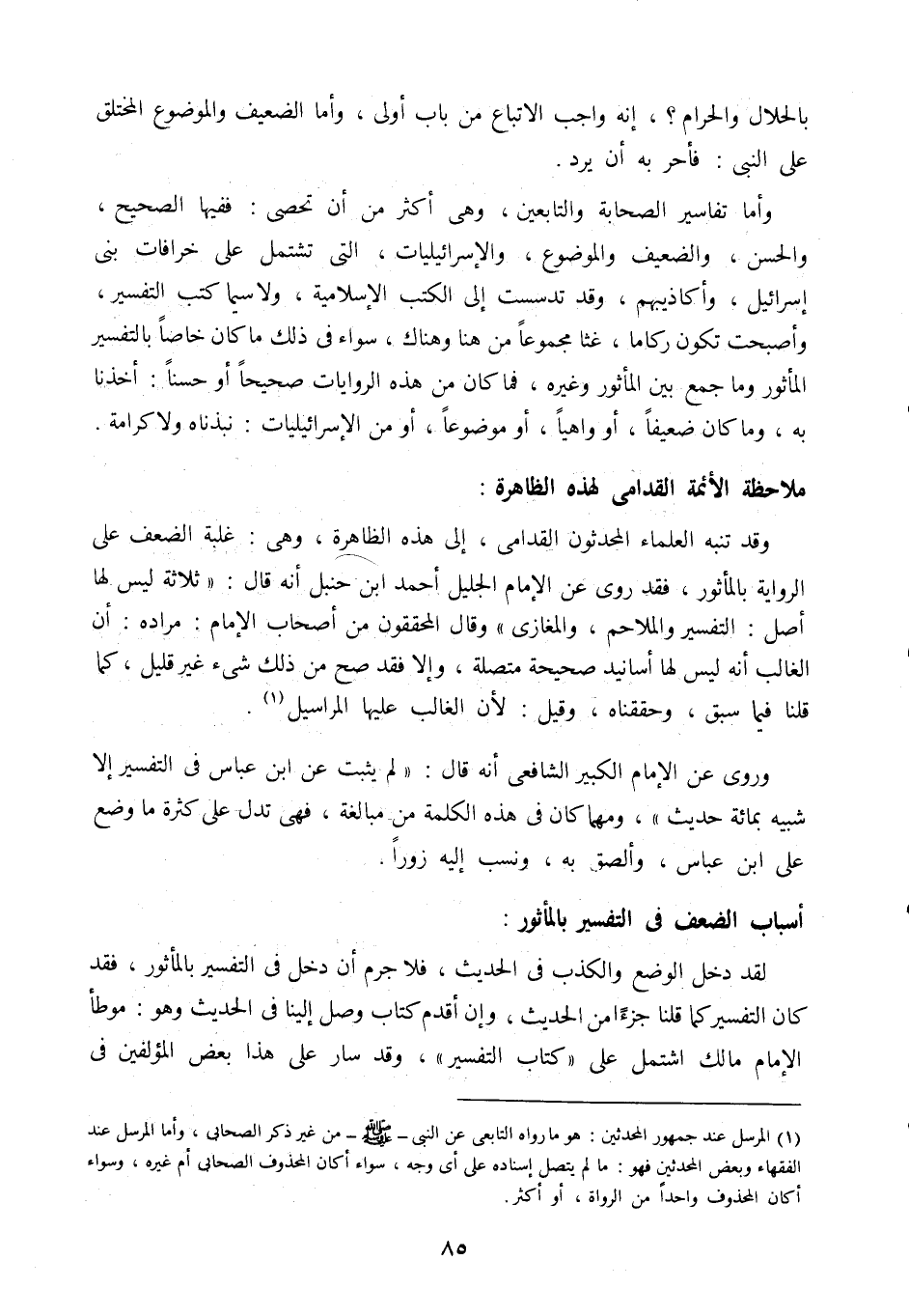 وقد تنبه العلماء المحدثون القدامى، إلى هذه الظاهرة، وهي: غلبة الضعف على الرواية بالمأثور، فقد روي عن الإمام الجليل أحمد بن حنبل أنه قال: "ثلاثة ليس لها أصل: التفسير والملاحم، والمغازي"، وقال المحققون من أصحاب الإمام: مراده: أن الغالب أنه ليس لها أسانيد صحيحة متصلة، وإلا فقد صح من ذلك شيء غير قليل، كما قلنا فيما سبق، وحققناه، وقيل: لأن الغالب عليها المراسيل1.