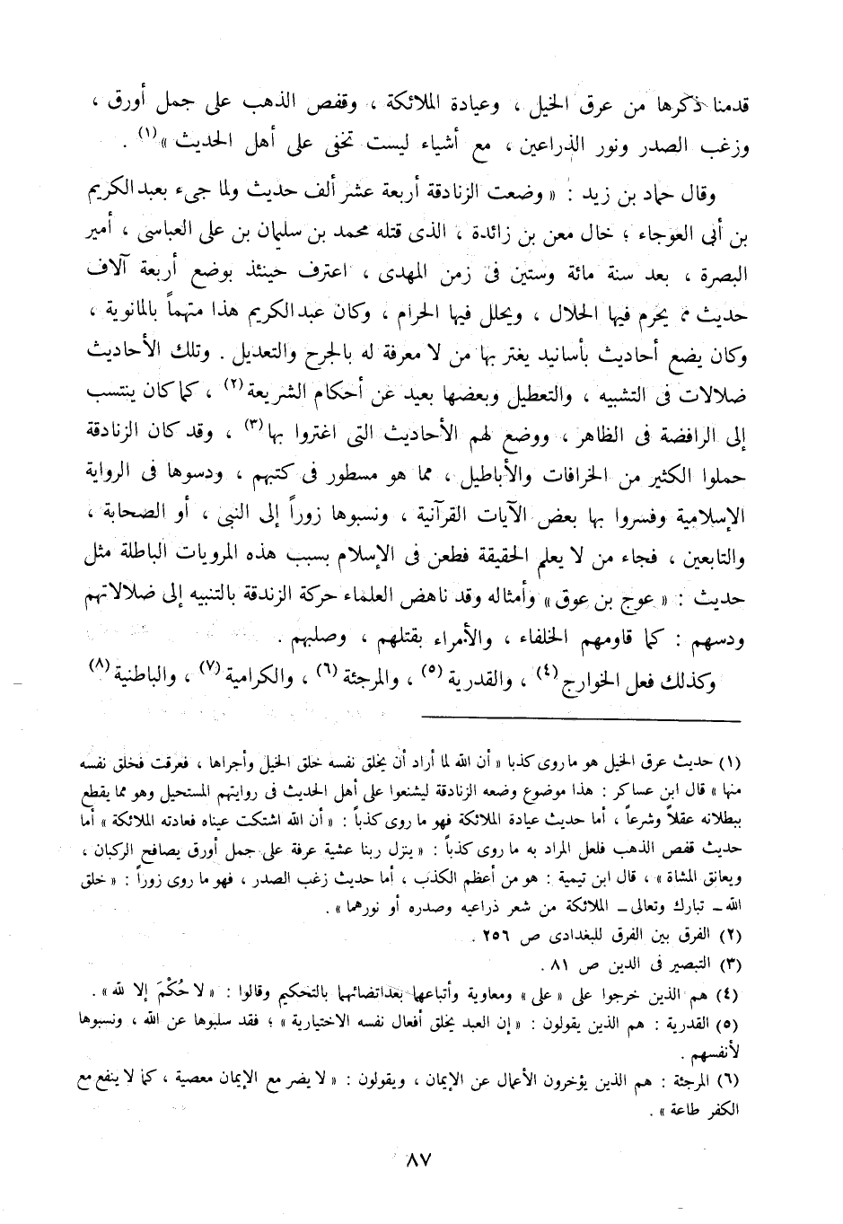 وقال حماد بن زيد: "وضعت الزنادقة أربعة عشر ألف حديث ولما جيء بعبد الكريم بن أبي العوجاء، خال معن بن زائدة، الذي قتله محمد بن سليمان بن علي العباسي، أمير البصرة، بعد سنة مائة وستين في زمن المهدي، اعترف حينئذ بوضع أربعة آلاف حديث مما يحرم فيها الحلال، ويحلل فيها الحرام، وكان عبد الكريم هذا متهما بالمانويه، وكان يضع أحاديث بأسانيد يغتر بها من لا معرفة له بالجرح والتعديل. وتلك الأحاديث ضلالات في التشبيه، والتعطيل وبعضها بعيد عن أحكام الشريعة2، كما كان ينتسب إلى الرافضة في الظاهر، ووضع لهم الأحاديث التي اغتروا بها3، وقد كان الزنادقة حملوا الكثير من الخرافات والأباطيل، مما هو مسطور في كتبهم، ودسوها في الرواية الإسلامية وفسروا بها بعض الآيات القرآنية، ونسبوها زورًا إلى النبي، أو الصحابة، والتابعين، فجاء من لا يعلم الحقيقة، فطعن في الإسلام بسبب هذه المرويات الباطلة مثل حديث: "عوج بن عوق"، وأمثاله وقد ناهض العلماء حركة الزندقة بالتنبيه إلى ضلالاتهم ودسهم: كما قاومهم الخلفاء، والأمراء بقتلهم، وصلبهم.