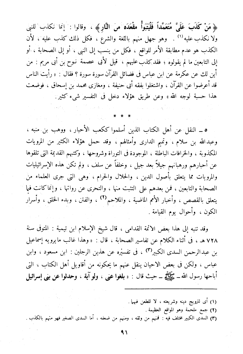 وقد تنبه إلى هذا بعض الأئمة القدامى، قال شيخ الإسلام ابن تيمية، المتوفى سنة 728هـ، في أثناء الكلام عن تفاسير الصحابة، قال: "وهذا غالب ما يرويه إسماعيل بن عبد الرحمن السدي الكبير3، في تفسيره عن هذين الرجلين: ابن مسعود، وابن عباس، ولكن في بعض الأحيان ينقل عنهم ما يحكونه من أقاويل أهل الكتاب، التي أباحها رسول الله صلى الله عليه وسلم حيث قال: "بلغوا عني ولو آية، وحدثوا عن بني إسرائيل