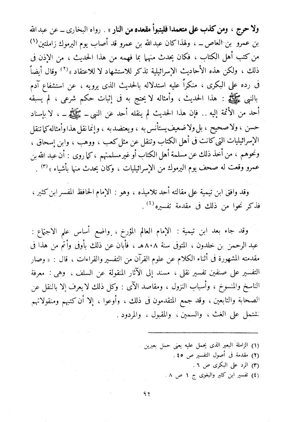 ولا حرج، ومن كذب عليَّ متعمدًا فليتبوأ مقعده من النار" رواه البخاري عن عبد الله بن عمرو بن العاص، ولهذا كان عبد الله بن عمرو قد أصاب يوم اليرموك زاملتين1 من كتب أهل الكتاب، فكان يحدث منهما بما فهمه من هذا الحديث، من الإذن في ذلك، ولكن هذه الأحاديث الإسرائيلية تذكر للاستشهاد لا للاعتقاد"2، وقال أيضًا في رده على البكري، منكرًا عليه استدلاله بالحديث الذي يرويه، عن استشفاع آدم بالنبي صلى الله عليه وسلم: هذا الحديث، وأمثاله لا يُحتج به في إثبات حكم شرعي، لم يسبقه أحد من الأئمة إليه..... فإن هذا الحديث لم ينقله أحد عن النبي صلى الله عليه وسلم لا بإسناد حسن، ولا صحيح، بل ولا ضعيف يستأنس به، ويعتضد به، وإنما نقل هذا وأمثاله كما تنقل الإسرائيليات التي كانت في أهل الكتاب وتنقل عن مثل كعب، ووهب، وابن إسحاق، ونحوهم، من أخذ ذلك عن مسلمة أهل الكتاب أو غير مسلمتهم كما روي: أن عبد الله بن عمرو وقعت له صحف يوم اليرموك من الإسرائيليات، وكان يحدث منها بأشياء"3.