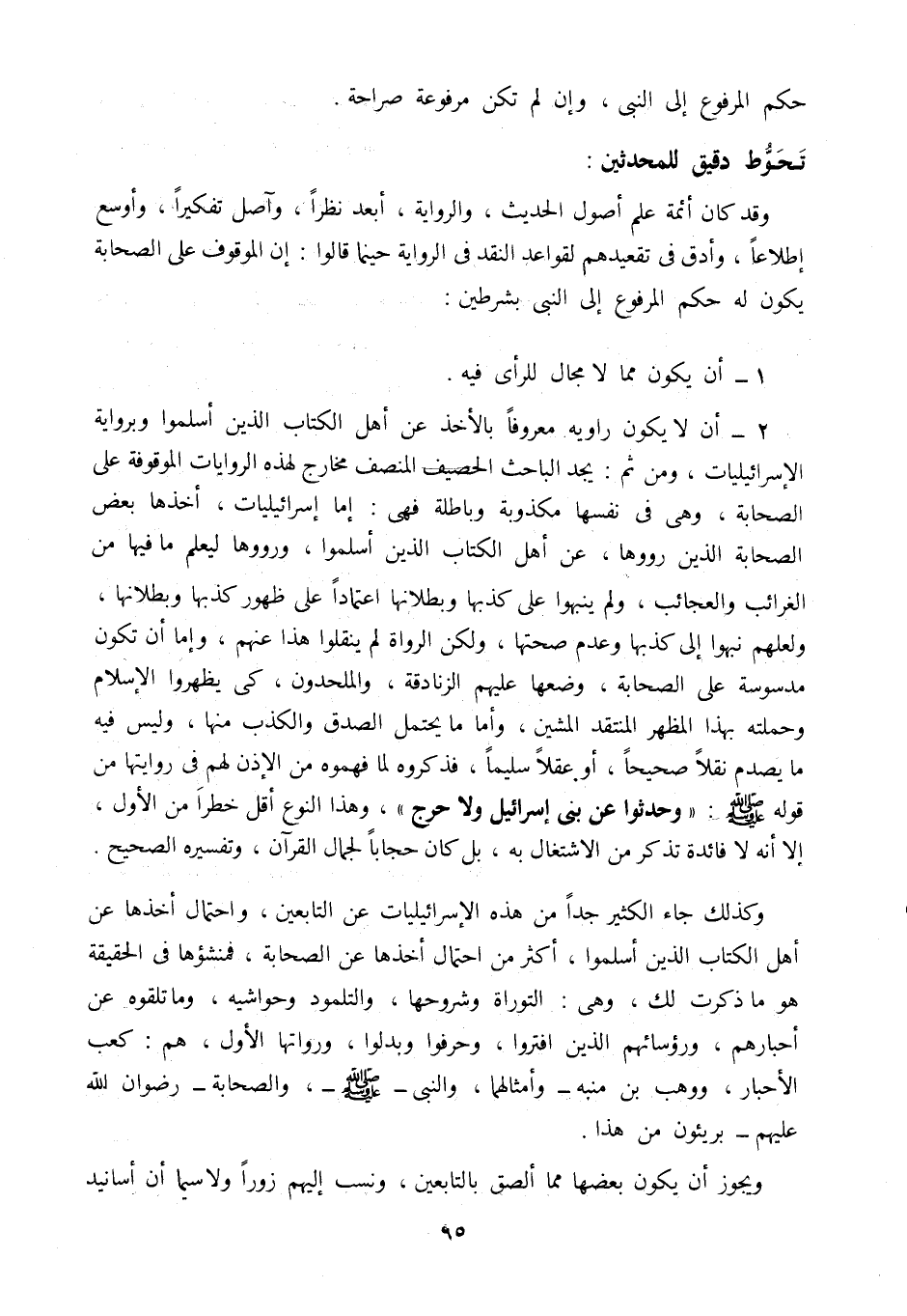 وقد كان أئمة علم أصول الحديث، والرواية، أبعد نظرًا، وآصل تفكيرًا، وأوسع اطلاعًا، وأدق في تقعيدهم لقواعد النقد في الرواية حينما قالوا: إن الموقوف على الصحابة يكون له حكم المرفوع إلى النبي بشرطين: