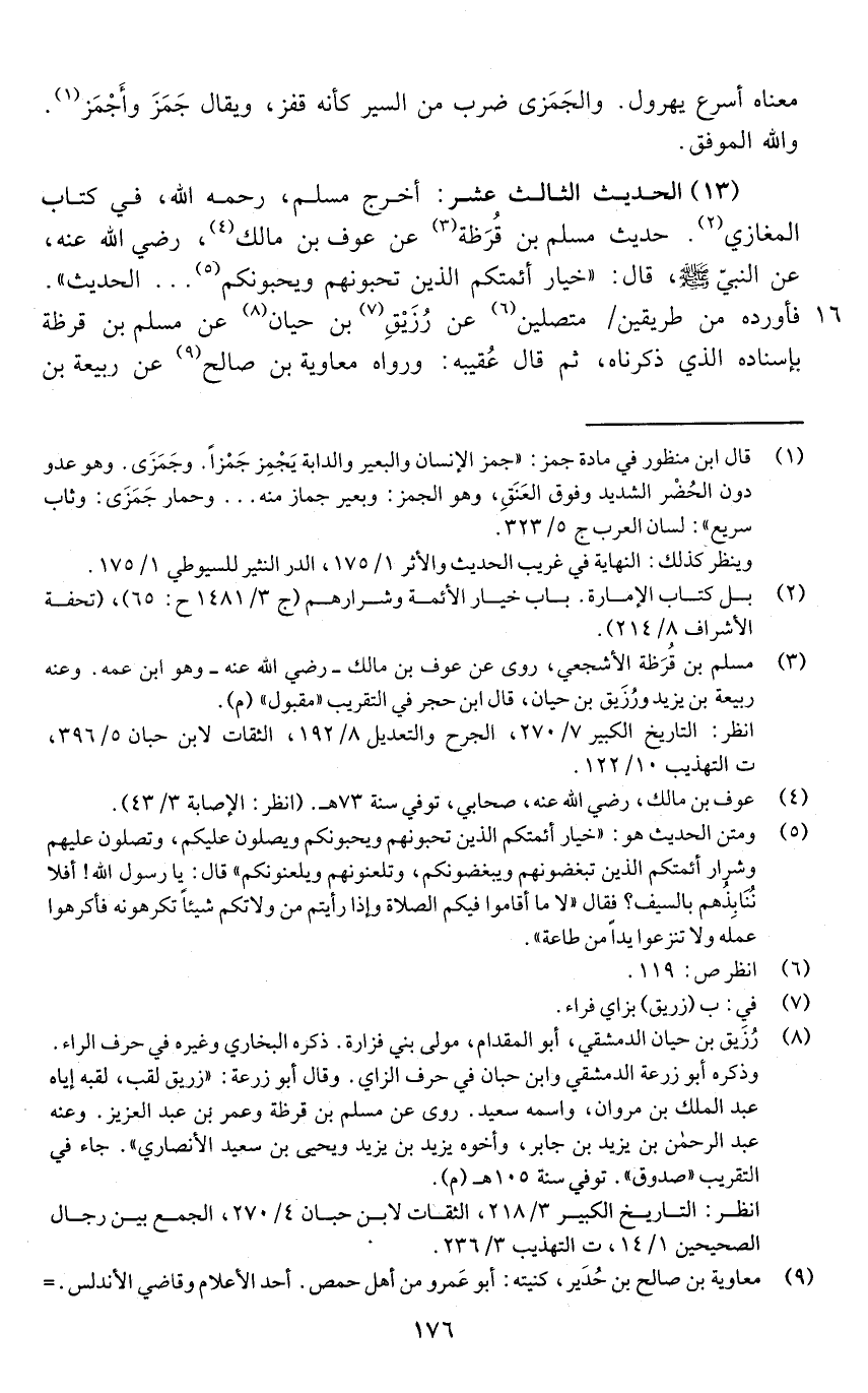 أخرج مسلم رحمه الله في كتاب المغازي حديث مسلم بن قرظه عن عوف بن مالك رضي الله عنه عن النبي صلى الله عليه وسلم قال خيار أئمتكم الذين تحبونهم ويحبونكم الحديث فأورده من طريقين متصلين عن رزيق بن حيان عن مسلم بن قرظه بإسناده الذي ذكرناه ثم قال عقيبة ورواه معاوية بن صالح عن ربيعة بن