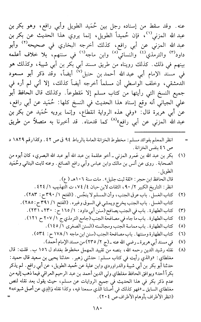 عنه وقد سقط من إسناده رجل بين حميد الطويل وأبي رافع وهو بكر بن عبد الله المزني فإن حميدا الطويل إنما يروي هذا الحديث عن بكر بن عبد الله المزني عن أبي رافع كذلك أخرجه البخاري في صحيحه وأبو داود والترمذي والنسائي وابن ماجه في سننهم بلا خلاف أعلمه بينهم في ذلك كذلك رويناه من طريق مسند أبي بكر بن أبي شيبة وكذلك هو في مسند الإمام أبي عبد الله أحمد بن حنبل أيضا وقد ذكر أبو مسعود الدمشقي وخلف الواسطي أن مسلما أخرجه أيضا كذلك إلا أني لم أره في جميع النسخ التي رأيتها من كتاب مسلم إلا مقطوعا وكذلك قال الحافظ أبو علي الجياني أنه وقع إسناد هذا الحديث في النسخ كلها حميد عن أبي رافع عن أبي هريرة قال وفي هذه الرواية انقطاع وإنما يرويه حميد عن بكر بن عبد الله المزني عن أبي رافع كما قدمناه قد أخبرنا به متصلا من طريق