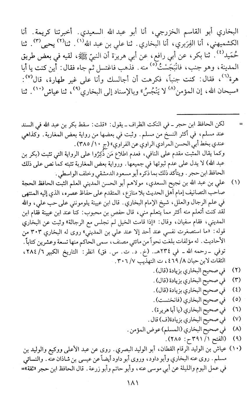 البخاري أبو القاسم الخزرجي أنا أبو عبد الله السعيدي أخبرتنا كريمة أنا الكشميهني أنا الفربري أنا البخاري ثنا علي بن عبد الله ثنا يحيى ثنا حميد ثنا بكر عن أبي رافع عن أبي هريرة أن النبي صلى الله عليه وسلم لقيه في بعض طريق المدينة وهو جنب فانبجست منه فذهب فاغتسل ثم جاء فقال أين كنت يا أبا هرة فقال كنت جنبا فكرهت أن أجالسك وأنا على غير طهارة قال سبحان الله إن المؤمن لا ينجس وبالإسناد إلى البخاري ثنا عياش ثنا