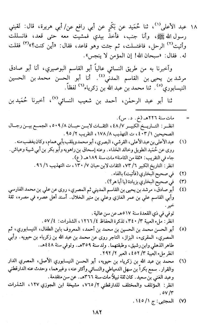 عبد الأعلى ثنا حميد عن بكر عن أبي رافع عن أبي هريرة قال لقيني رسول الله صلى الله عليه وسلم وأنا جنب فأخذ بيدي فمشيت معه حتى قعد فانسللت وأتيت الرحل فاغتسلت ثم جئت وهو قاعد فقال أين كنت فقلت له فقال سبحان الله إن المؤمن لا ينجس وأخبرنا به من طريق النسائي عاليا أبو القاسم البوصيري أنا أبو صادق مرشد بن يحيى بن القاسم المدني أنا أبو الحسن محمد بن الحسين النيسابوري ثنا محمد بن عبد الله بن زكرياء لفظا ثنا أبو عبد الرحمن أحمد بن شعيب النسائي أخبرنا حميد بن
