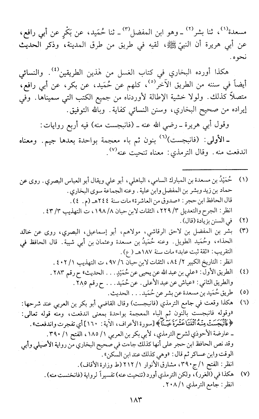 مسعدة ثنا بشر وهو ابن المفضل ثنا حميد عن بكر عن أبي رافع عن أبي هريرة أن النبي صلى الله عليه وسلم لقيه في طريق من طرق المدينة وذكر الحديث نحوه هكذا أورده البخاري في كتاب الغسل من هذين الطريقين والنسائي أيضا في سننه من الطريق الآخر كلهم عن حميد عن بكر عن أبي رافع متصلا كذلك ولولا خشية الإطالة لوردناه تعالى من جميع الكتب التي سميناها وفي إيراده من صحيح البخاري وسنن النسائي كفاية وبالله التوفيق وقول أبي هريرة رضي الله عنه فانبجست منه فيه أربع روايات الأولى فانبجست بنون ثم باء معجمة بواحدة بعدها جيم ومعناه اندفعت منه وقال الترمذي معناه تنحيت عنه