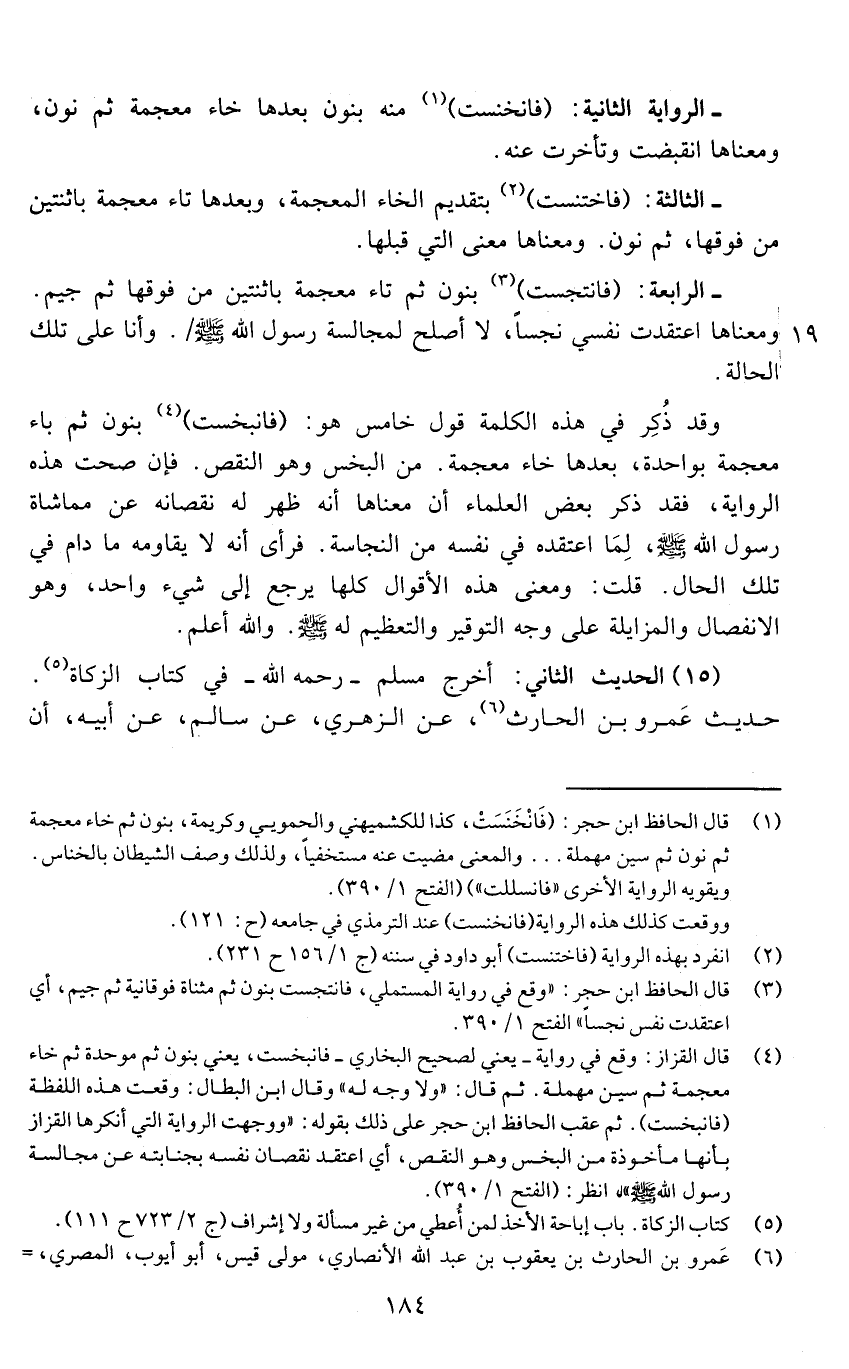 الرواية الثانية فانخنست منه بنون بعدها خاء معجمة ثم نون ومعناها انقبضت وتأخرت عنه الثالثة فاختنست بتقديم الخاء المعجمة وبعدها تاء معجمة باثنتين من فوقها ثم نون ومعناها معنى التي قبلها الرابعة فانتجست بنون ثم تاء معجمة باثنتين من فوقها ثم جيم ومعناها اعتقدت نفسي نجسا لا أصلح لمجالسة رسول الله صلى الله عليه وسلم وأنا على تلك الحالة وقد ذكر في هذه الكلمة قول خامس هو فانبخست بنون ثم باء معجمة بواحدة بعدها خاء معجمة من البخس وهو النقص فإن صحت هذه الرواية فقد ذكر بعض العلماء أن معناها أنه ظهر له نقصانه عن مماشاة رسول الله صلى الله عليه وسلم لما اعتقده في نفسه من النجاسة فرأى أنه لا يقاومه ما دام في تلك الحال قلت ومعنى هذه الأقوال كلها يرجع إلى شئ واحد وهو الانفصال والمزايلة على وجه التوقير والتعظيم له صلى الله عليه وسلم والله أعلم