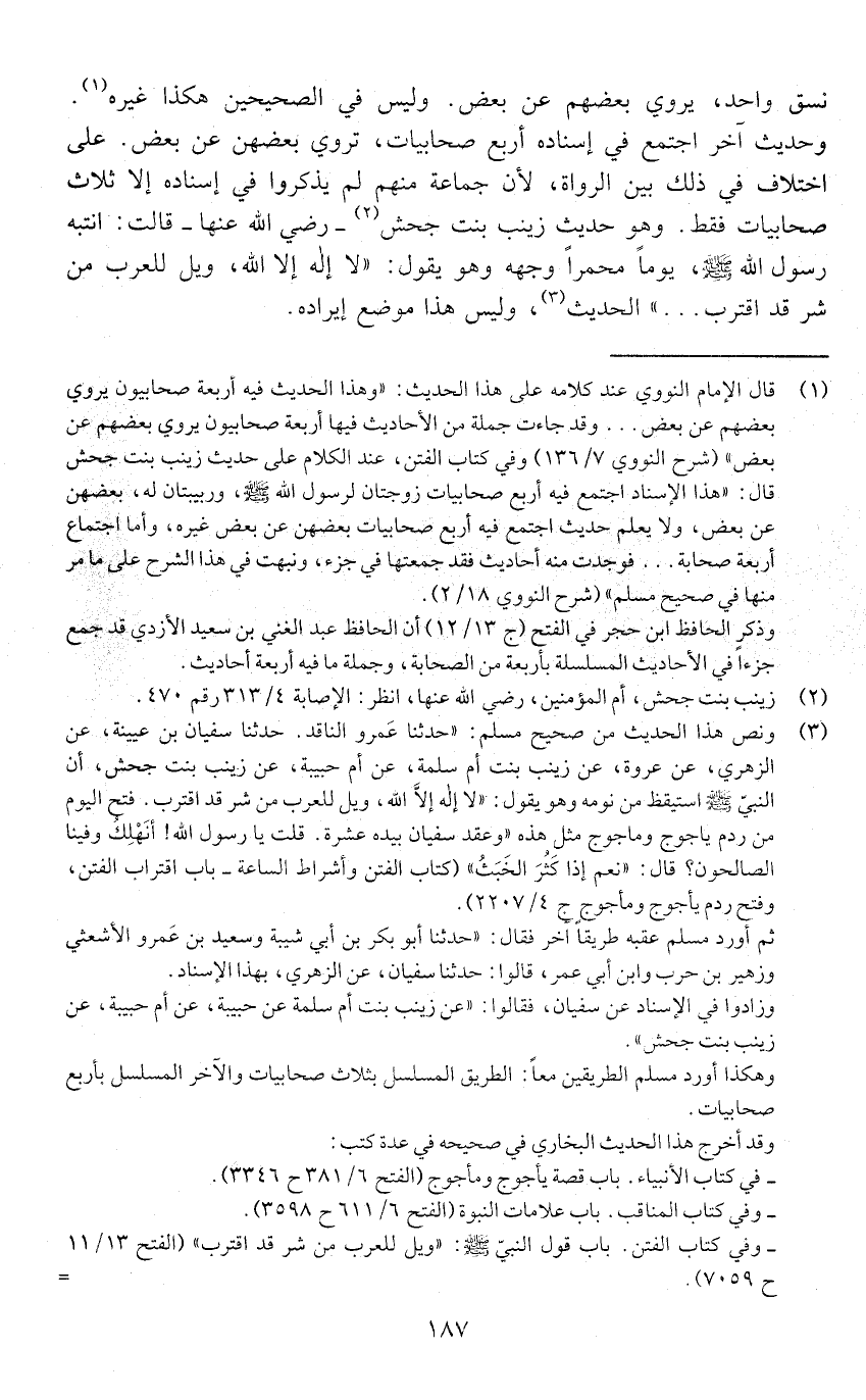 نسق واحد يروي بعضهم عن بعض وليس في الصحيحين هكذا غيره وحديث آخر اجتمع في إسناده أربع صحابيات تروي بعضهن عن بعض على اختلاف في ذلك بين الرواة لأن جماعة منهم لم يذكروا في إسناده إلا ثلاث صحابيات فقط وهو حديث زينب بنت جحش رضي الله عنها قالت انتبه رسول الله صلى الله عليه وسلم يوما محمرا وجهه وهو ويقول لا إله إلا الله ويل للعرب من شر قد اقترب الحديث وليس هذا موضع إيراده