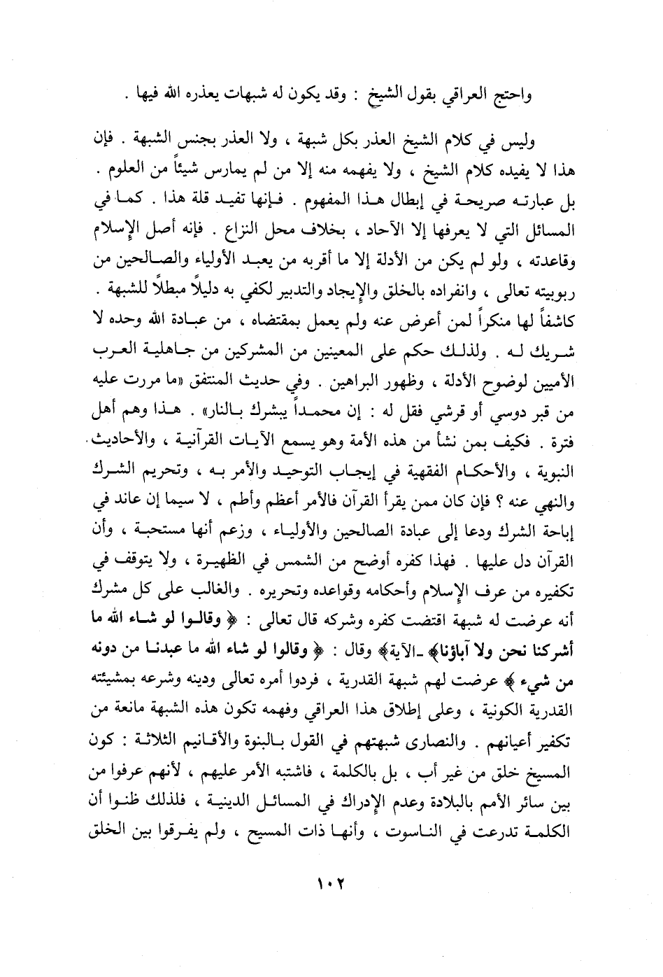 وليس في كلام الشيخ العذر بكل شبهة، ولا العذر بجنس الشبهة، فإن هذا لا يفيده كلام الشيخ، ولا يفهمه منه إلا من لم يمارس شيئاً من العلوم. بل عبارته صريحة في إبطال هذا المفهوم. فإنها تفيد قلة هذا، كما في المسائل التي يعرفها إلا الآحاد، بخلاف محل النزاع، فإنه أصل الإسلام وقاعدته، ولو لم يكن من الأدلة إلا ما أقر به من يعبد الأولياء والصالحين من ربوبيته تعالى، وانفراده بالخلق والإيجاد والتدبير لكفي به دليلاً مبطلاً للشبهة. كاشفاً لها منكراً لمن أعرض عنه ولم يعمل بمقتضاه، من عبادة الله وحده لا شريك له، ولذلك حكم على المعينين من المشركين من جاهلية العرب الأميين لوضوح الأدلة، وظهور البراهين. وفي حديث المنتفق: "ما مررت عليه من قبر دوسي أو قرشي فقل له: إن محمداً يبشّرك بالنّار". هذا وهم أهل فترة. فكيف بمن نشأ من هذه الأمة وهو يسمع الآيات القرآنية، والأحاديث النبوية، والأحكام الفقهية من إيجاب التوحيد والأمر به، وتحريم الشرك والنهي عنه؟ فإن كان ممن يقرأ القرآن فالأمر أعظم وأطم، لا سيما إن عاند في إباحة الشرك ودعا إلى عبادة الصالحين والأولياء، وزعم أنها مستحبة، وأن القرآن دل عليها. فهذا كفره أوضح من الشمس في الظهيرة، ولا يتوقف في تكفيره من عرف الإسلام وأحكامه وقواعده وتحريره، والغالب على كل مشرك أنه عرضت له شبهة اقتضت كفره وشركه، قال تعالى: {لَوْ شَاءَ اللَّهُ مَا أَشْرَكْنَا وَلا آبَاؤُنَا} الآية (الأنعام: من الآية148) ، وقال: {وَقَالَ الَّذِينَ أَشْرَكُوا لَوْ شَاءَ اللَّهُ مَا عَبَدْنَا مِنْ دُونِهِ مِنْ شَيْءٍ} (النحل: من الآية35) عرضت لهم شبهة القدرية، فردوا أمره تعالى ودينه وشرعه بمشيئته القدرية الكونية، وعلى إطلاق هذا العراقي وفهمه تكون هذه الشبهة مانعة من تكفير أعيانهم. والنصارى شبهتهم في القول بالبنوة والأقانيم الثلاثة: كون المسيح خُلق من غير أب، بل بالكلمة، فاشتبه الأمر عليهم؛ لأنهم عرفوا من بين سائر الأمم بالبلادة وعدم الإدراك في المسائل الدينية، فلذلك ظنوا أن الكلمة تدرعت في الناسوت، وأنها ذات المسيح، ولم يفرقوا بين الخلق