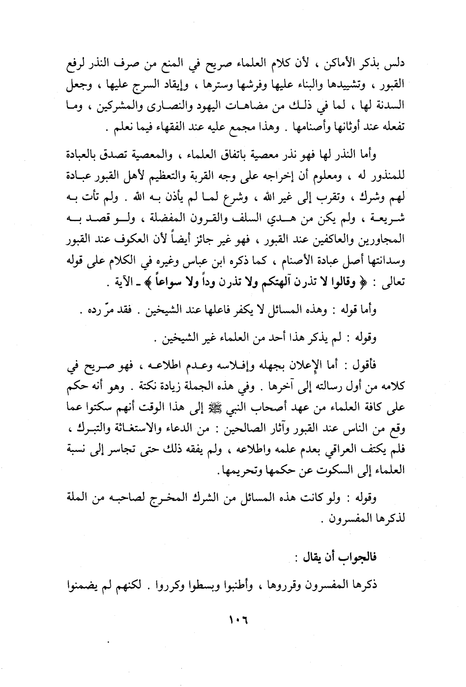 دلس بذكر الأماكن؛ لأنّ كلام العلماء صريح في المنع من صرف النذر لرفع القبور، وتشييدها والبناء عليها وفرشها وسترها، وإيقاد السرج عليها، وجعل السدنة لها، لما في ذلك من مضاهات اليهود والنصارى والمشركين، وما تفعله عند أوثانها وأصنامها، وهذا مجمع عليه عند الفقهاء فيما نعلم.
