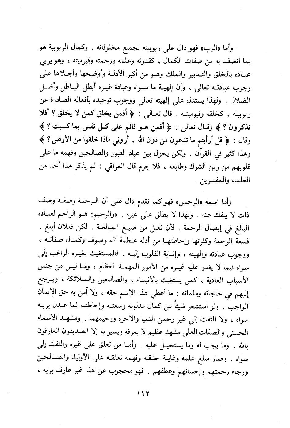 وأمّا "الربّ" فهو دال على ربوبيته لجميع مخلوقاته، وكمال الربوبية هو بما اتصف به من صفات الكمال، كقدرته وعلمه ورحمته وقيوميته، وهو يربي عباده بالخلق والتدبير والملك وهو من أكبر الأدلة وأوضحها وأجلاها على وجوب عبادته تعالى، وأن إلهية ما سواه وعبادة غيره أبطل الباطل وأضل الضلال، ولهذا يستدل على إلهيته تعالى ووجوب توحيده بأفعاله الصادرة عن ربوبتيه، كخلقه وقيوميته. قال تعالى: {أَفَمَنْ يَخْلُقُ كَمَنْ لا يَخْلُقُ أَفَلا تَذَكَّرُونَ} (النحل:17) ، وقال تعالى: {أَفَمَنْ هُوَ قَائِمٌ عَلَى كُلِّ نَفْسٍ بِمَا كَسَبَتْ} (الرعد: من الآية33) ، وقال: {قُلْ أَرَأَيْتُمْ مَا تَدْعُونَ مِنْ دُونِ اللَّهِ أَرُونِي مَاذَا خَلَقُوا مِنَ الْأَرْضِ} (الاحقاف: من الآية4) ، وهذا كثير في القرآن، ولكن يحول بين عباد القبور والصالحين وفهمه ما على قلوبهم من رين الشرك وطابعه، فلا جرم قال العراقي: لم يذكر هذا أحدٌ من العلماء والمفسرين.